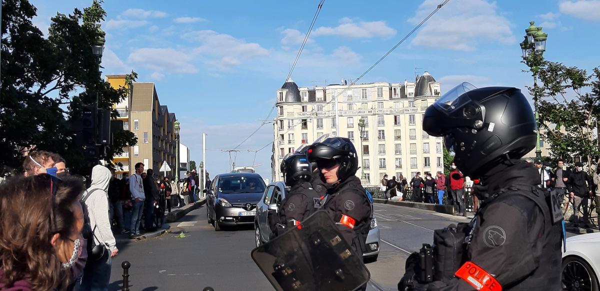 Ile saint-Denis le 11 mai 2020, premier jour du déconfinement, rassemblement unitaire de plusieurs centaines de personnes devant la mairie pour constituer une chaine humaine vers Villeneuve la Garenne et dénoncer les violences policières, le racisme des forces de l'ordre dans les quartiers populaires. La police présente massivement empèche la constitution de la chaine.