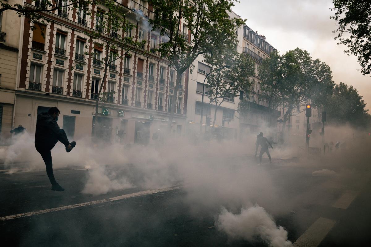 France, Paris, 2021-05-15. La foule parmi des lacrymos. Manifestation en soutien de la Palestine maintenue malgre son interdiction. Photographie de Martin Noda / Hans Lucas