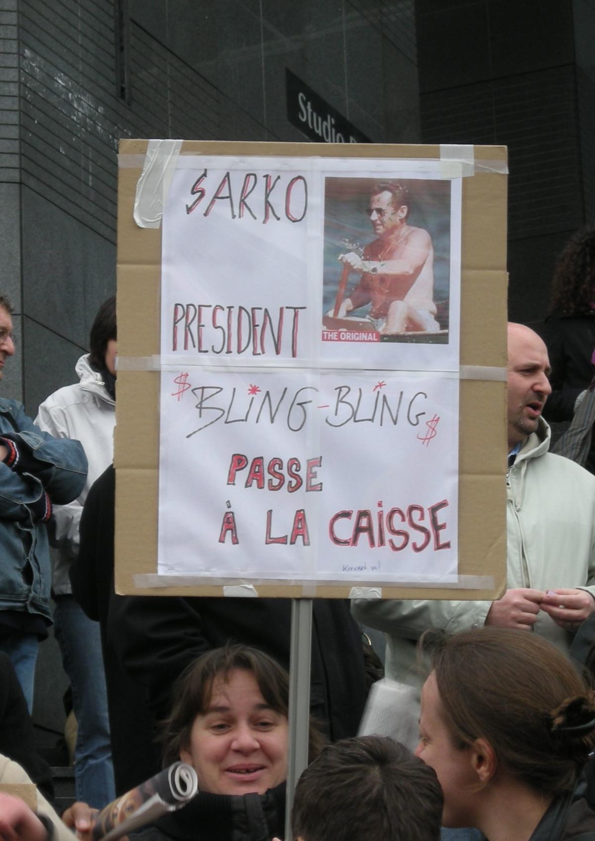 Pancarte : Sarkozy président bling bling passe à la caisse