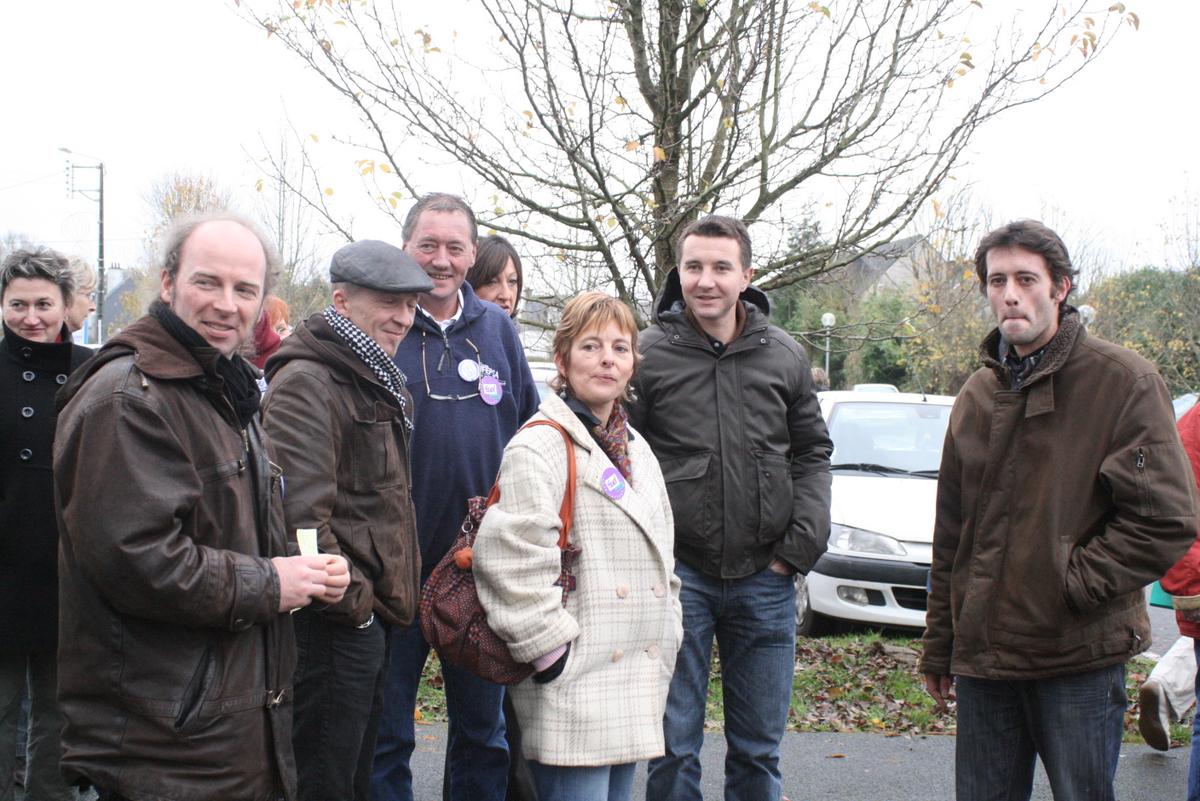 Olivier Besancenot en compagnie de militants lors de sa venue à Carhaix le 15 décembre 2008.