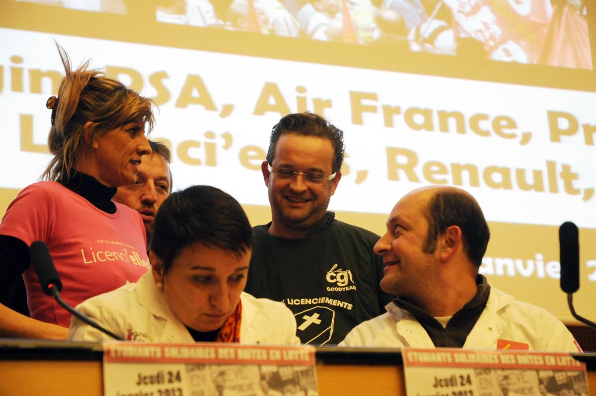 Meeting pour la convergence des luttes avec des représentants dentreprises menacés par des suppressions demplois, Sanofi, PSA, Goodyear, 3 Suisses, Virgin, Renault, Air France, Presstalis. 24janvier 2013 Paris
