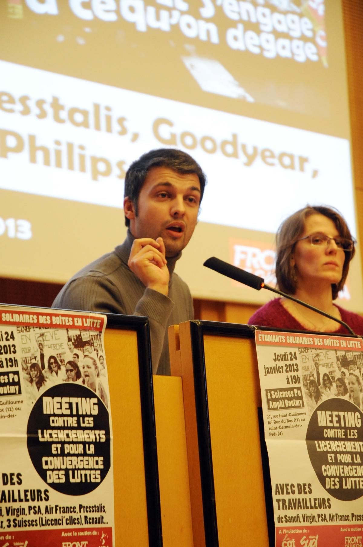 Meeting pour la convergence des luttes avec des représentants dentreprises menacés par des suppressions demplois, Sanofi, PSA, Goodyear, 3 Suisses, Virgin, Renault, Air France, Presstalis. 24janvier 2013 Paris