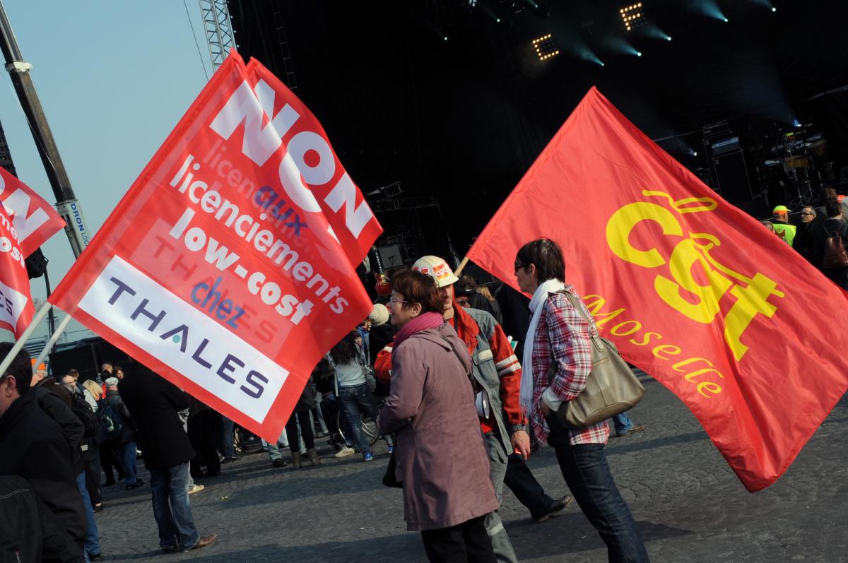 Les sidérurgistes d'Arcélor Mittal marchent de Florange à Paris pour la défense de l'acier lorrain, pour la remise en route des haut-fourneaux et le maintien des emplois. Il arrivent sous la Tour Eiffel le 6 avril 2012.