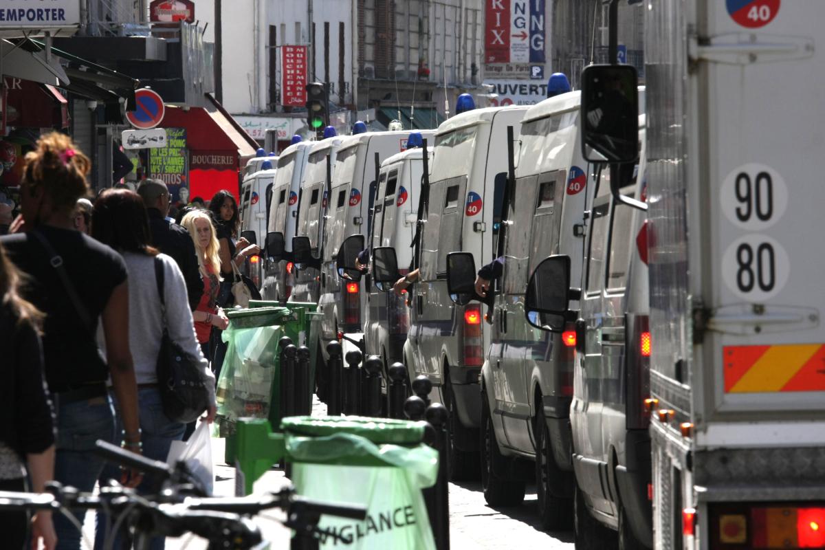 un colonne de cars de CRS précède la manifestation rue Belleville