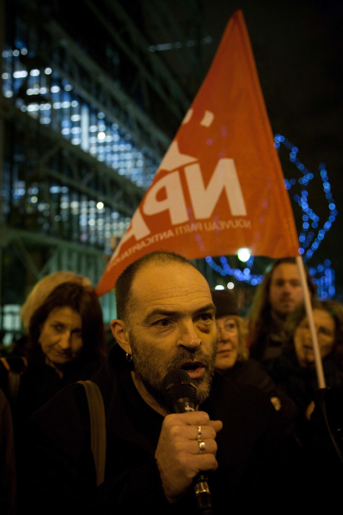 11 janvier 2012. Suite à l'interpellation et au tabassage de Denis Godard au motif qu'il sifflait l'internationale lors d'un contrôle d'identité, un rassemblement est organisé par Act Up, le NPA et le Front de Gauche devant le commissariat du 3ème arrondissement de Paris.