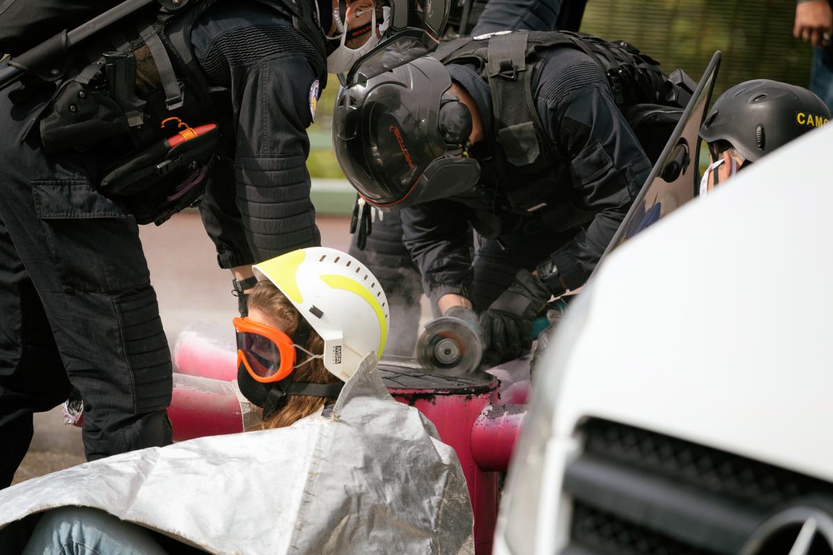 La police, pour proceder a leur interpellation, essaye de casser le dispositif avec lequel les militants d'Extinction Rebellion se sont enchaines pour bloquer un pont, action de XR contre Lubrizol, Rouen, 26 septembre 2020. Photographie de Martin Noda / Hans Lucas