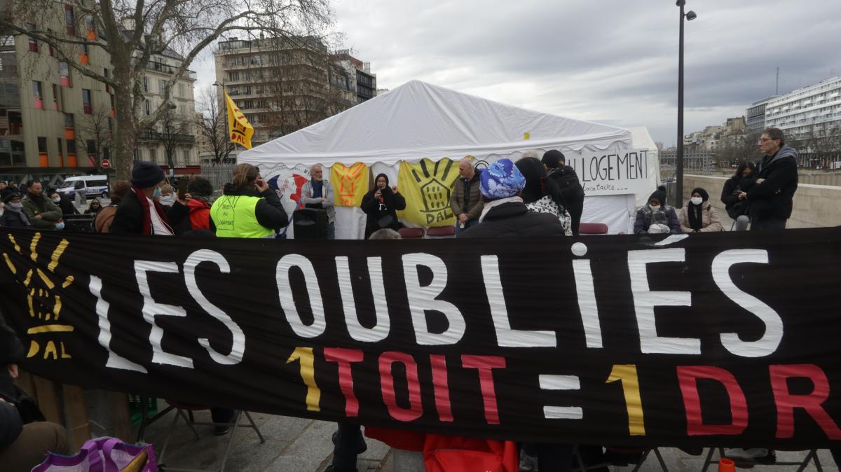 Dimanche 13 mars 2022, place de la Bastille à Paris, Campement organisé par le DAL pour les oublié.es du DALO. Philippe Poutou vient les soutenir.