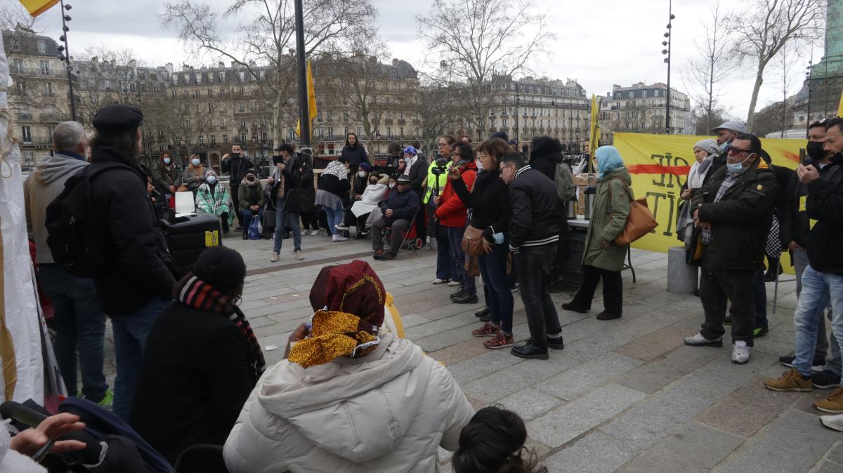 Dimanche 13 mars 2022, place de la Bastille à Paris, Campement organisé par le DAL pour les oublié.es du DALO. Philippe Poutou vient les soutenir.