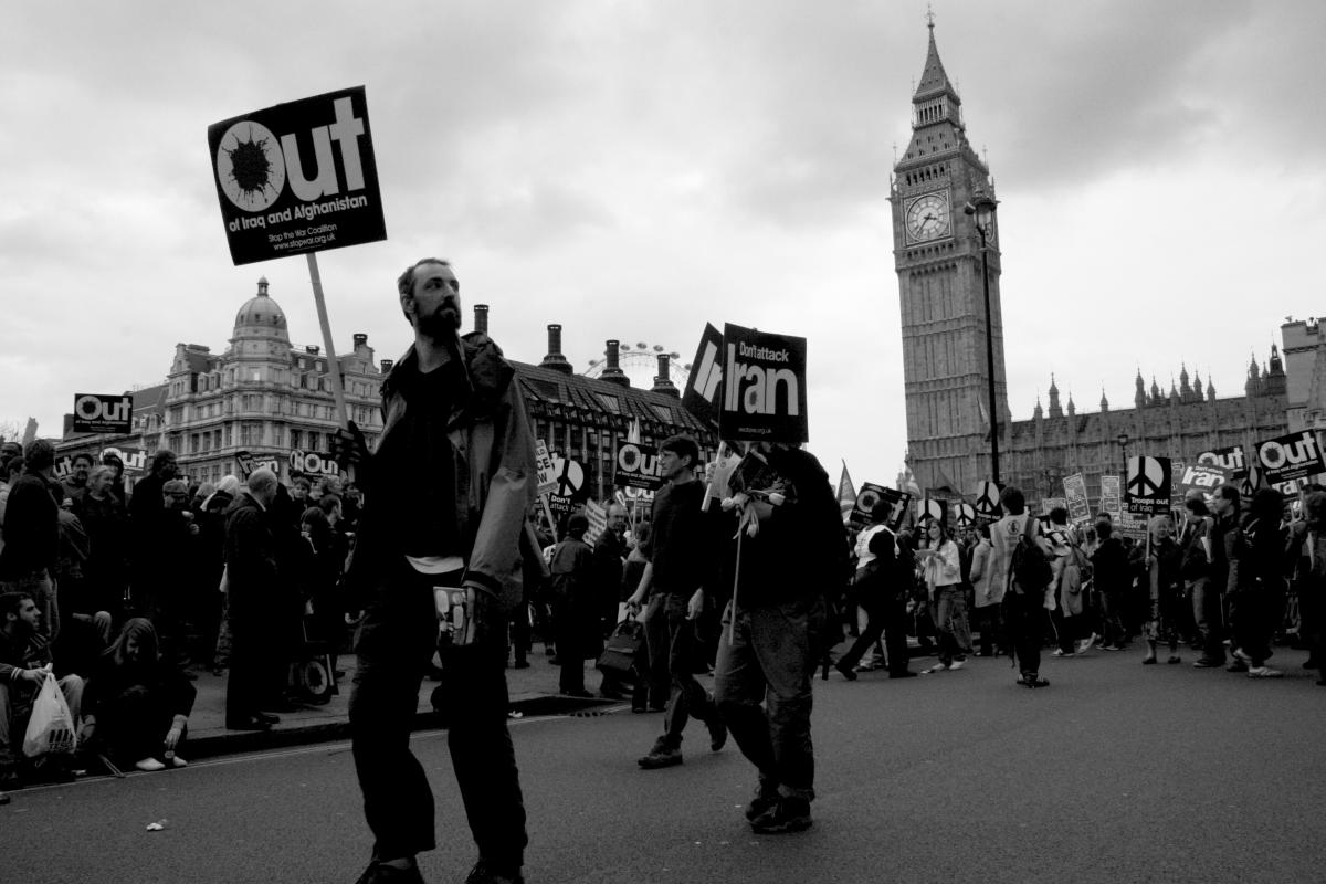 Manifestants face au Parlement anglais le 15 mars 2008 lors de la marche contre la guerre.