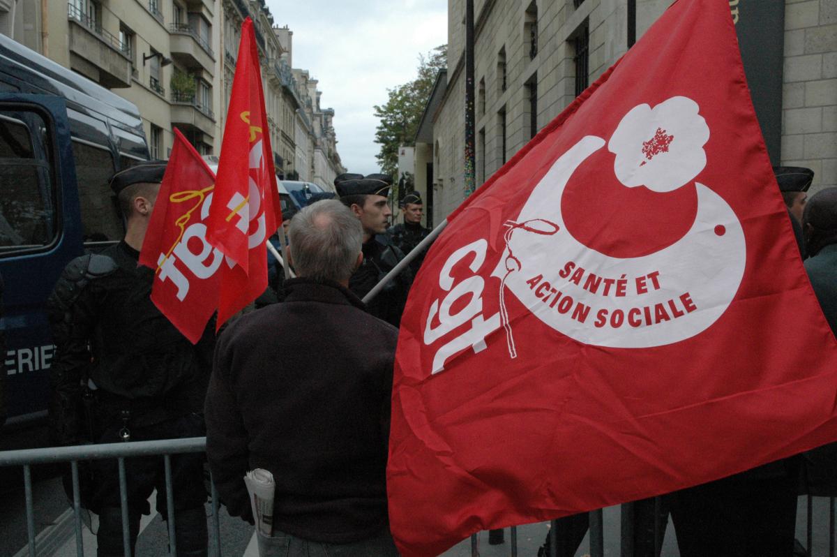 Manifestants CGT santé avec leurs drapeaux devant des CRS bloquant les accès au ministère du Travail.