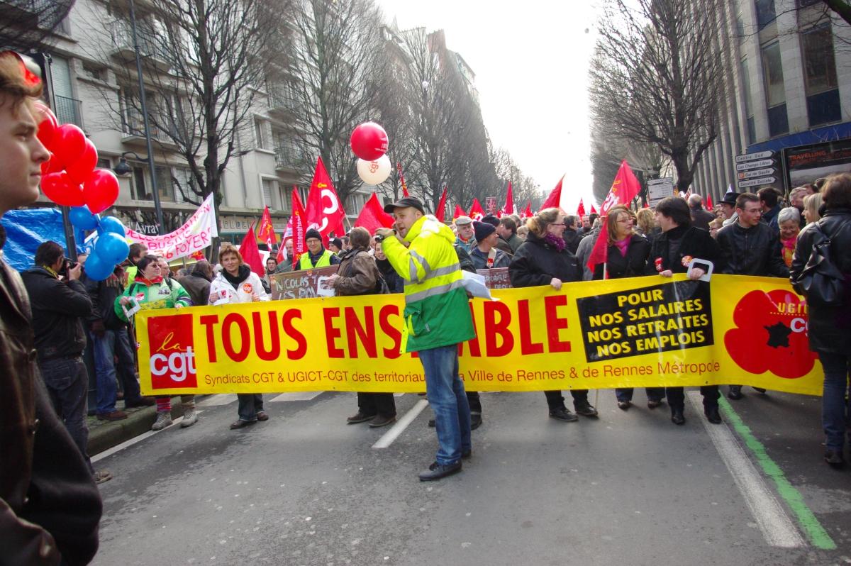 manifestation interprofessionel du 29 janvier à Rennes plus de 40 000 personnes dans la rue , avancée dificile du cortége de part le nombre de manifestants