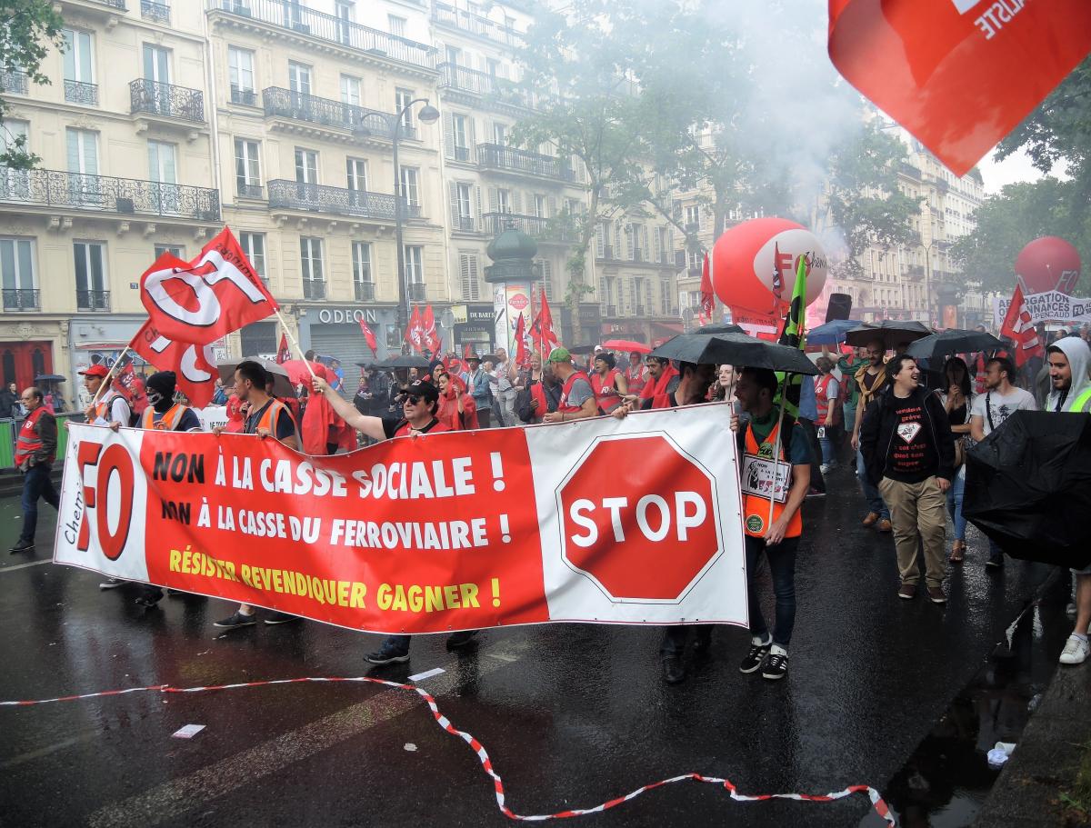 Cortège de FO Non à la casse sociale non à la casse du ferroviaire résister revendiquer gagner