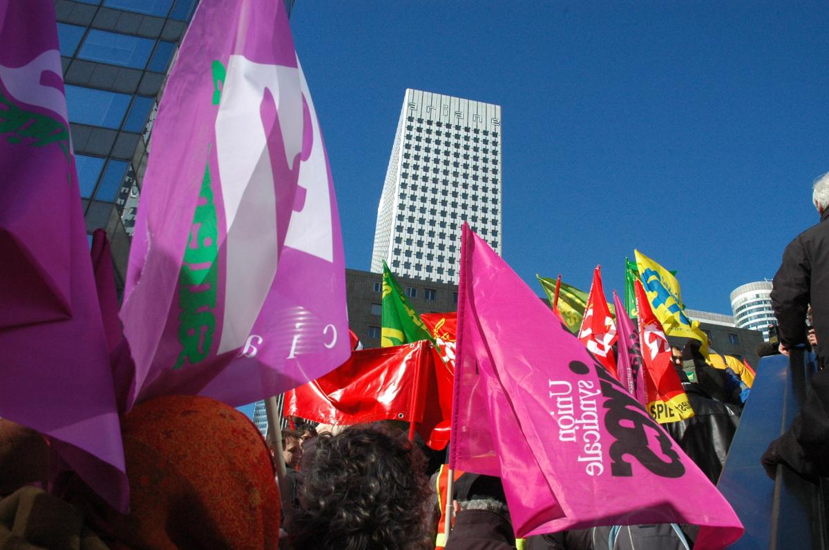 Drapeaux des syndicats Sud énergie Solidaires, devant la Défense Paris.