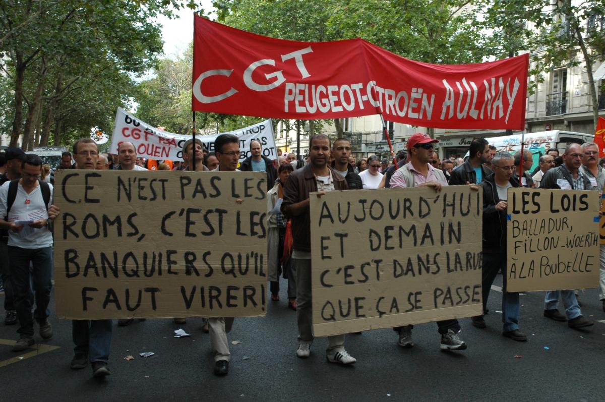 banderole Cgt Peugeot-Citroën Aulnay, les lois Balladur, Fillon, Woerth à la poubelle.
