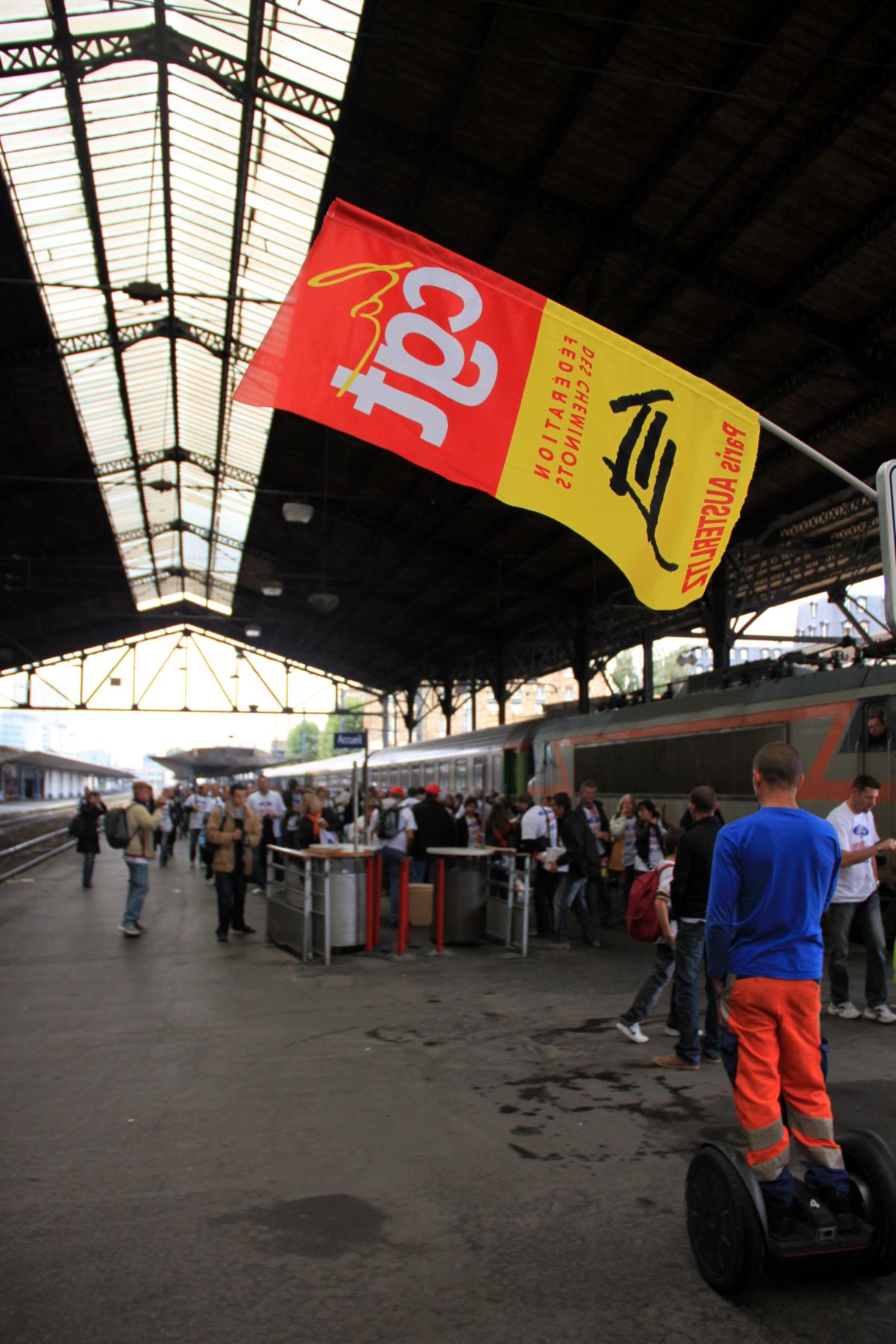 Arrivée de salariés de Ford Blanquefort à Austerlitz, sous l'oeil d'un cheminot, et d'un drapeau CGT.