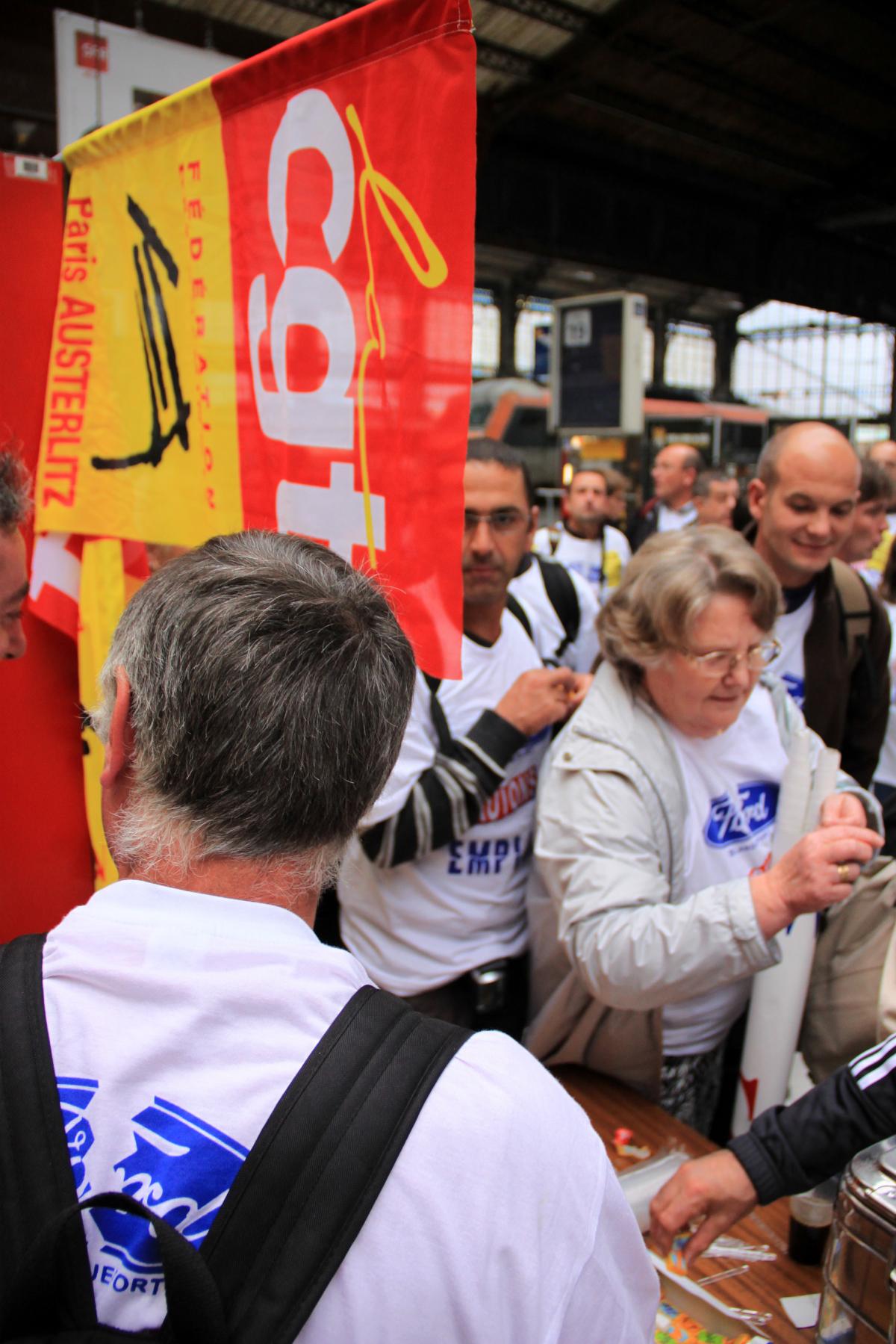 Paris, samedi 2 octobre. A l'occasion de l'ouverture du Mondial de l'Automobile, les salariés de Ford Blanquefort en lutte pour leurs emplois viennent manifester. Ils seront accueillis et soutenus par les cheminots d'Austerlitz.
