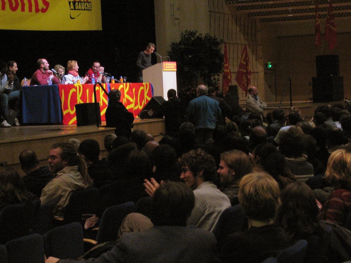 Meeting à la Mutualité de la LCR avec à la tribune, entre autres, Olivier Besancenot (porte-parole de la LCR), une militante des JCR), une militante du Collectif National Droit des Femmes, et des représentants de salariés en lutte des bagagistes de Roissy, des colis postaux, et des Reynolds. Paris/2006/11/30/CM.