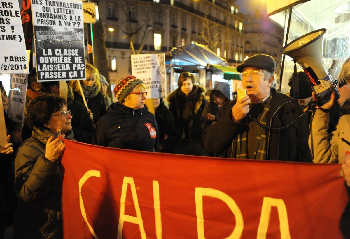 Devant lambassade dArgentine rassemblement pour lacquittement des travailleurs de Las Heras. manifestation également Place de Mai à Buenos Aires Contre dinjustes sentences édictées par le tribunal de Caleta Oliva le 12 décembre 2013 à lencontre de neuf travailleurs du secteur pétrolier de Las Heras, province de Santa Cruz Argentine. 4 dentre eux ont été condamnés à perpétuité sans preuve 5 Février 2014 Paris
