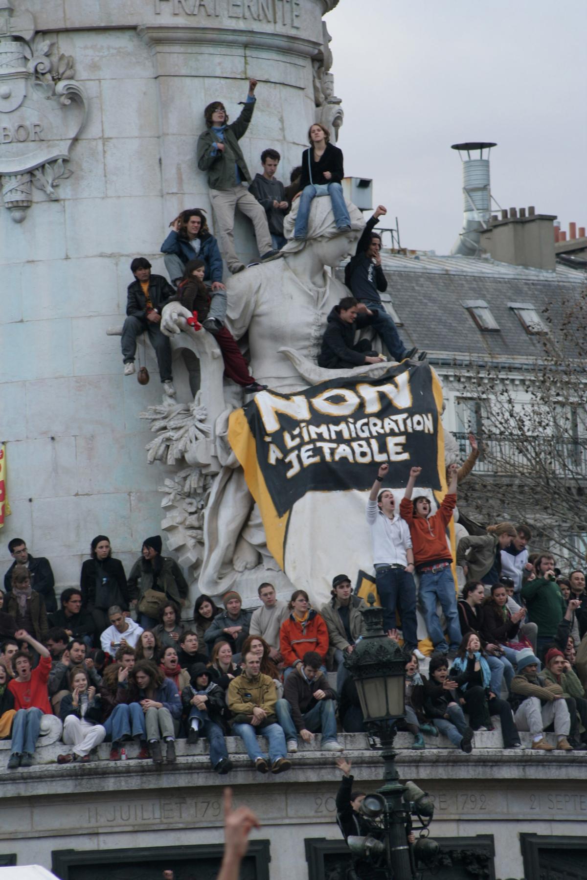 Concert place de la république le 2 avril 2006 contre le projet de loi Sarkozy de refonte du CESEDA. Les spectateurs sont montés sur la statue de la république.