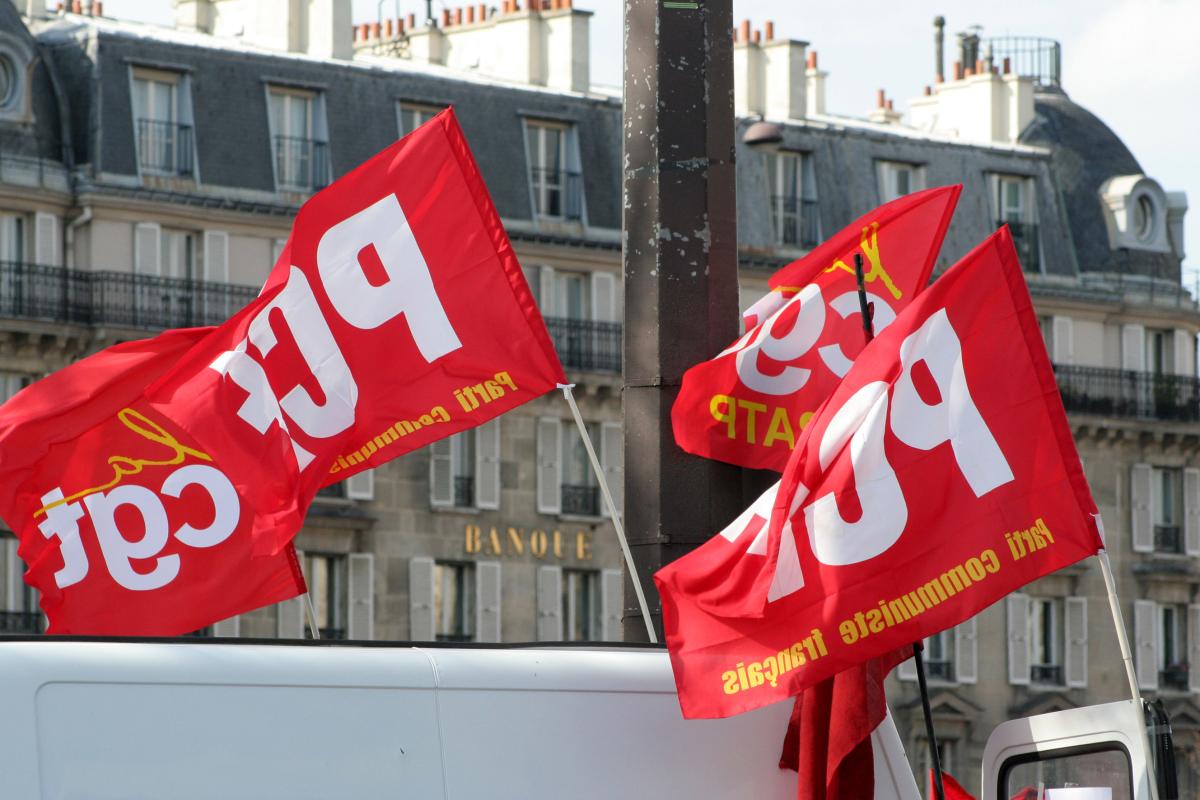 drapeaux PC et CGT au point fixe du PC place de la Bastille le jour de la manifestation du 4 avril 2006 contre le CPE