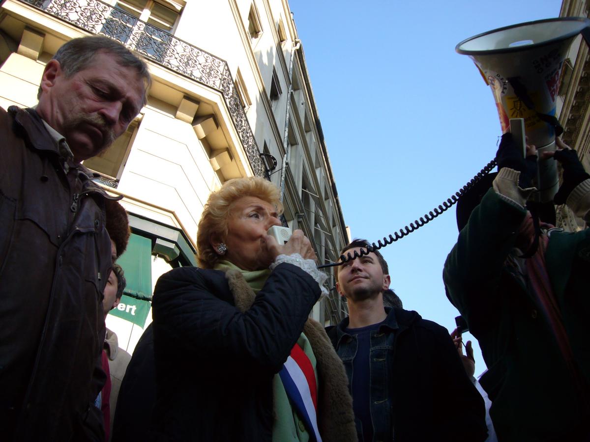Manifestation contre le missile M51 devant. Vers 9h30, une quarantaine d « inspecteurs citoyens » du collectif « Non au missile M51 », aidés de la sénatrice Hélène Luc et des candidats à la présidentielle Olivier Besancenot et José Bové se sont présentés aux portes de lElysée pour exiger du Conseil des Ministres quil cesse de défendre une politique de réarmement nucléaire en contravention avec le Traité de Non Prolifération. De forts effectifs policiers les ont immédiatement cernés puis malmenés pendant près de deux heures. Paris, le 04 avril 2007 ph :Babar
