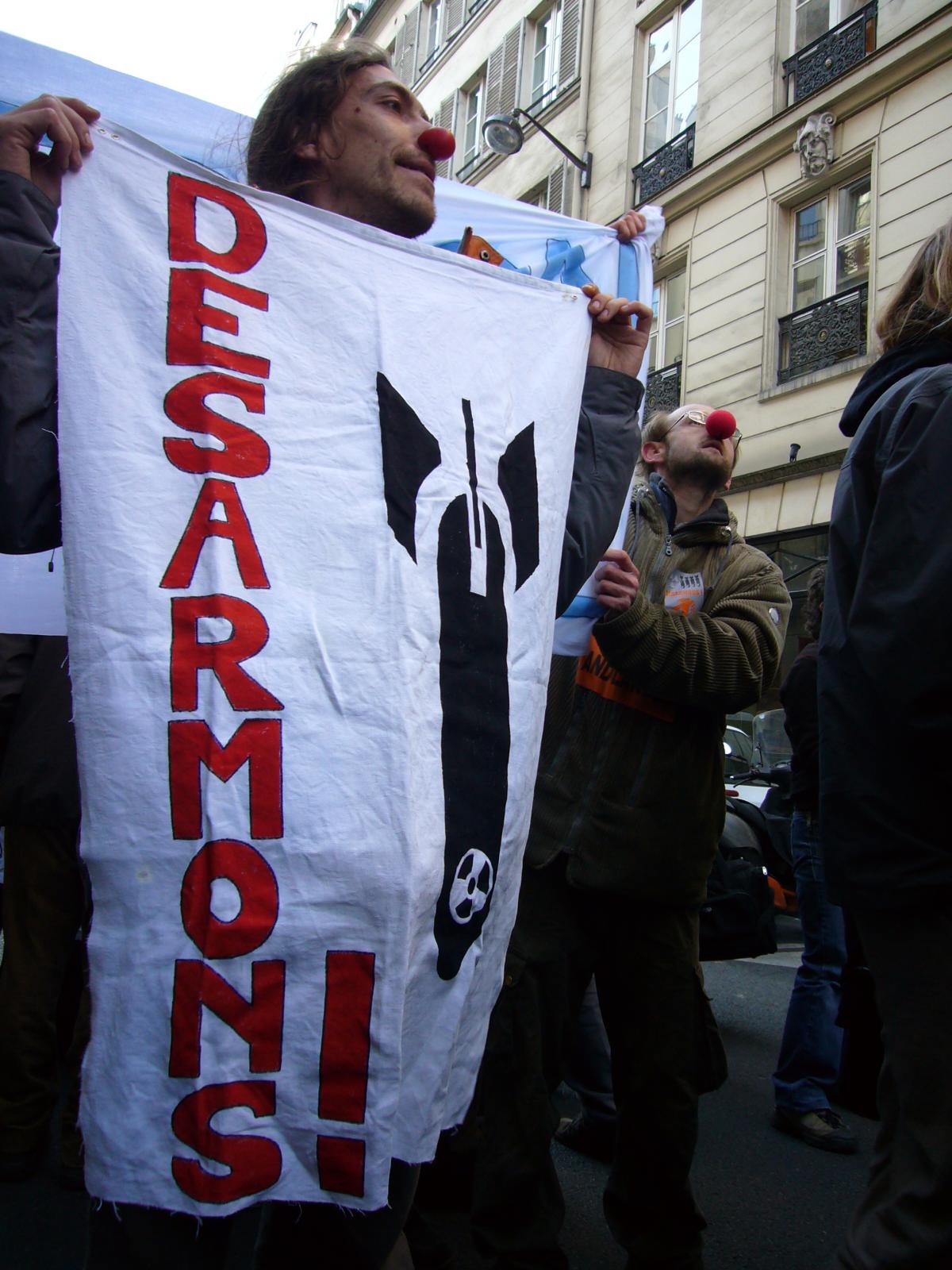 Manifestation contre le missile M51 devant. Vers 9h30, une quarantaine d « inspecteurs citoyens » du collectif « Non au missile M51 », aidés de la sénatrice Hélène Luc et des candidats à la présidentielle Olivier Besancenot et José Bové se sont présentés aux portes de lElysée pour exiger du Conseil des Ministres quil cesse de défendre une politique de réarmement nucléaire en contravention avec le Traité de Non Prolifération. De forts effectifs policiers les ont immédiatement cernés puis malmenés pendant près de deux heures. Paris, le 04 avril 2007 ph :Babar