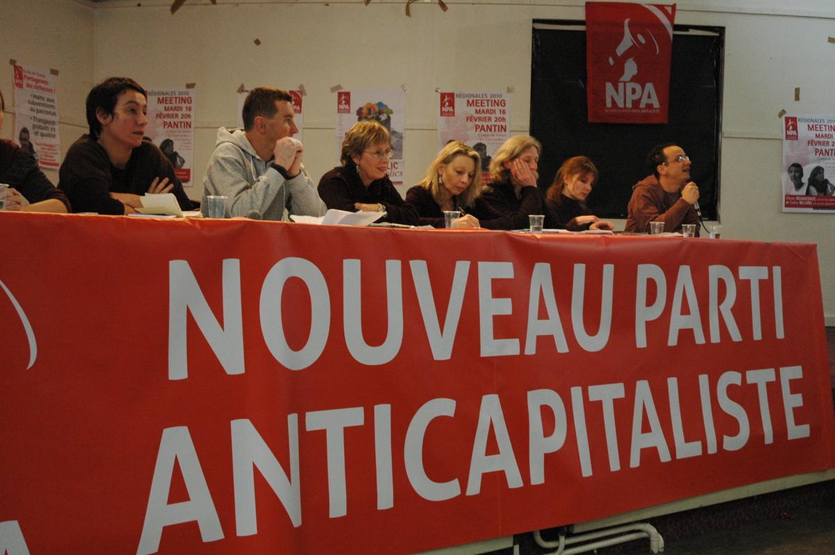 Lancement de la campagne régionale en ile de France bourse du travail de Saint Denis 07 02 2010. Olivier Besancenot présente les Huit têtes de liste départementales qui expriment chacune leurs thêmes d'intervention de leur département. (transport gratuit,logement,soutien à une grève. et luttes des Sans-Papiers)
