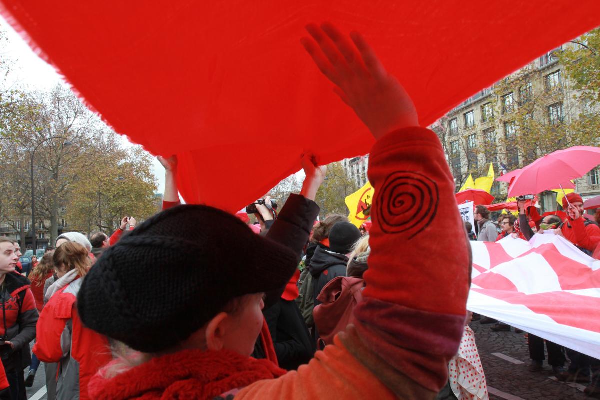 Paris, le 12 décembre 2015. Marche et lignes rouges pour la fin de la COP21 entre l'avenue de la Grande Armée et le Champ de Mars en passant par le Trocadéro. Sous haute protection policière.