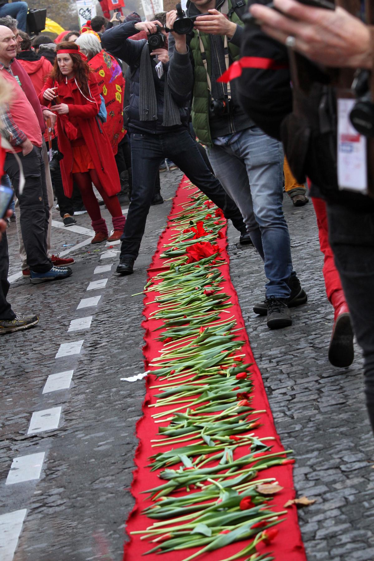 Paris, le 12 décembre 2015. Marche et lignes rouges pour la fin de la COP21 entre l'avenue de la Grande Armée et le Champ de Mars en passant par le Trocadéro. Sous haute protection policière.