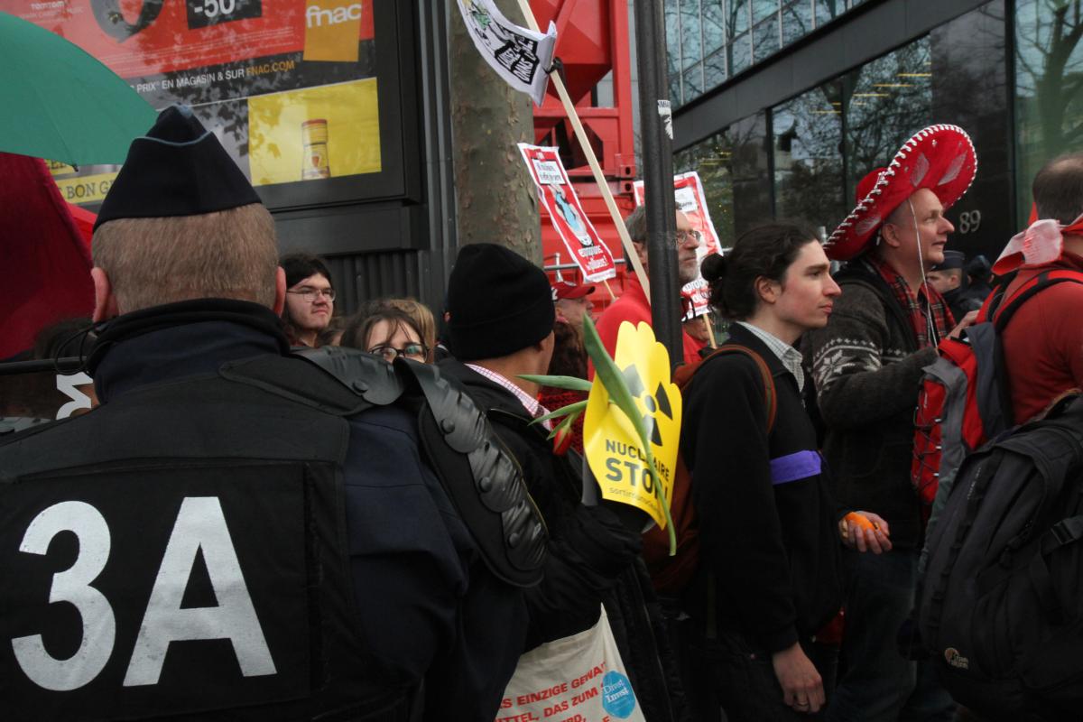 Paris, le 12 décembre 2015. Marche et lignes rouges pour la fin de la COP21 entre l'avenue de la Grande Armée et le Champ de Mars en passant par le Trocadéro. Sous haute protection policière.