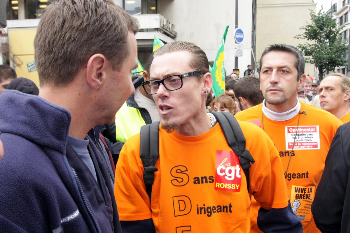 Olivier Besancenot en discussion avec un salarié de UTI