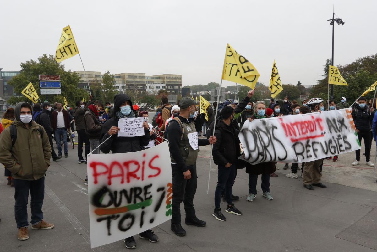 Saint-Denis les 16 et 17 octobre 2020, les marcheurs sans-papiers et les chômeurs, en provenance de Lille, arrivent à Saint-Denis. Manifestation dans la ville, Rassemblement devant l'hôtel de ville, rassemblement sur le camp des migrants de la Porte de Paris et départ pour La Porte de la Chapelle.