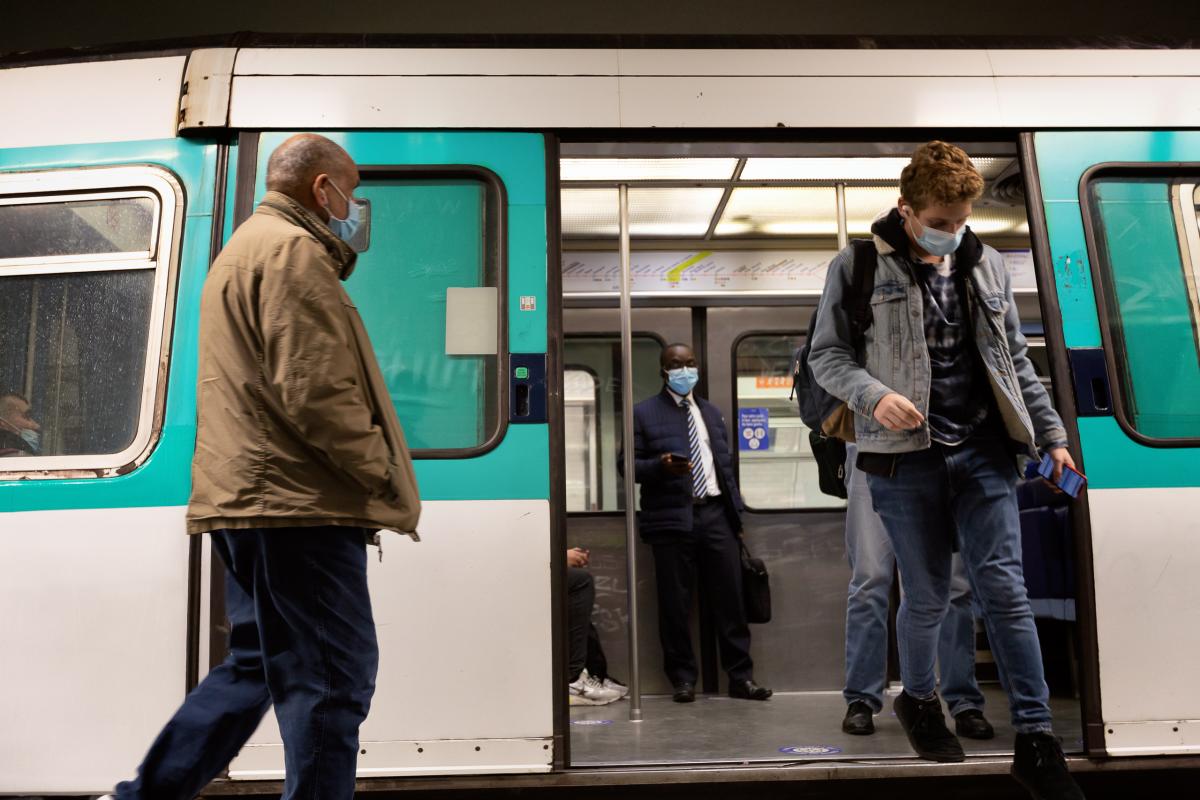 Masked passangers get off a metro line 7 train, Paris, November 5 2020. Photograph by Martin Noda / Hans Lucas.