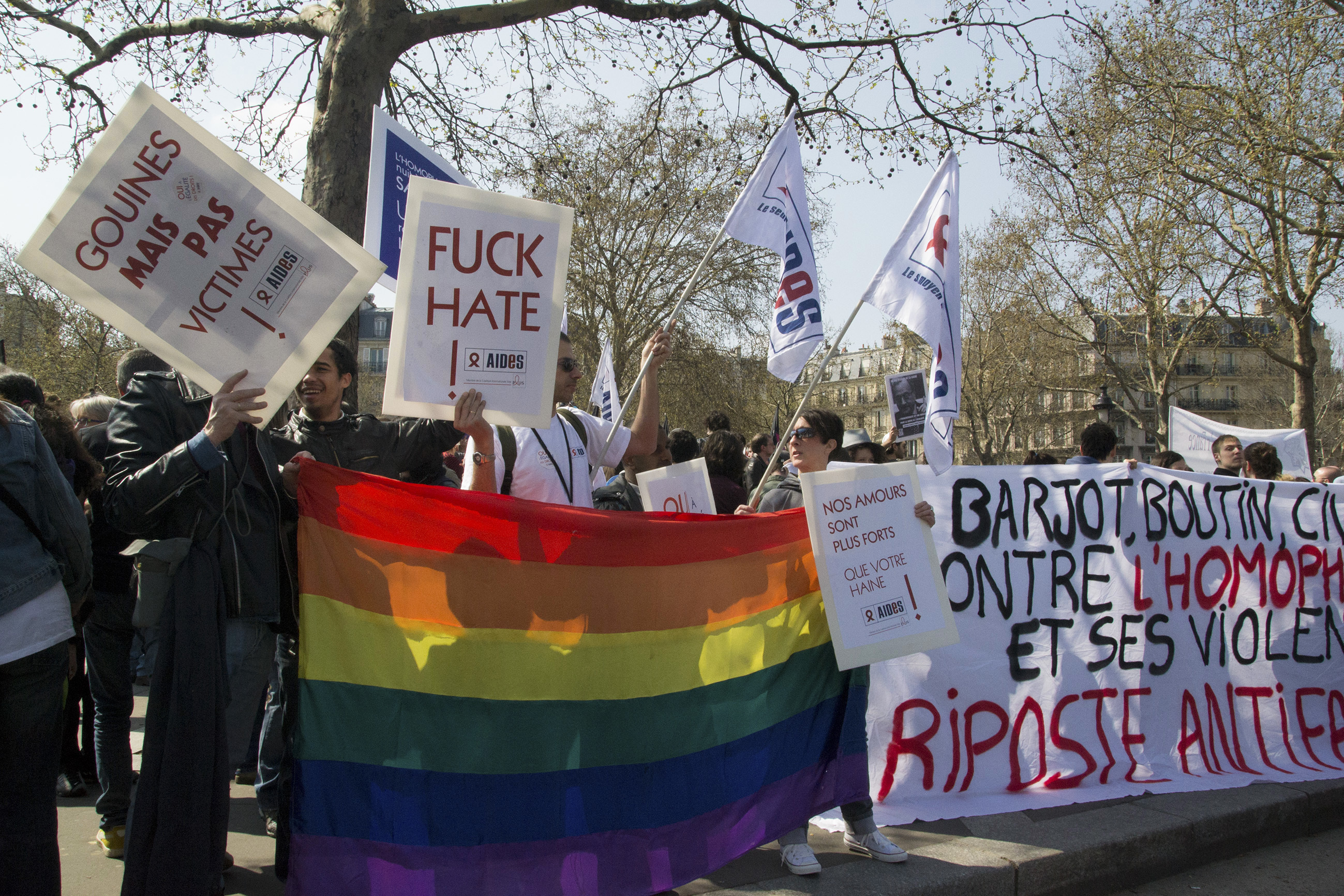 Télécharger la photo “Rassemblement pour l'égalité des droits - Drapeau LGBT et pancartes Aides”
