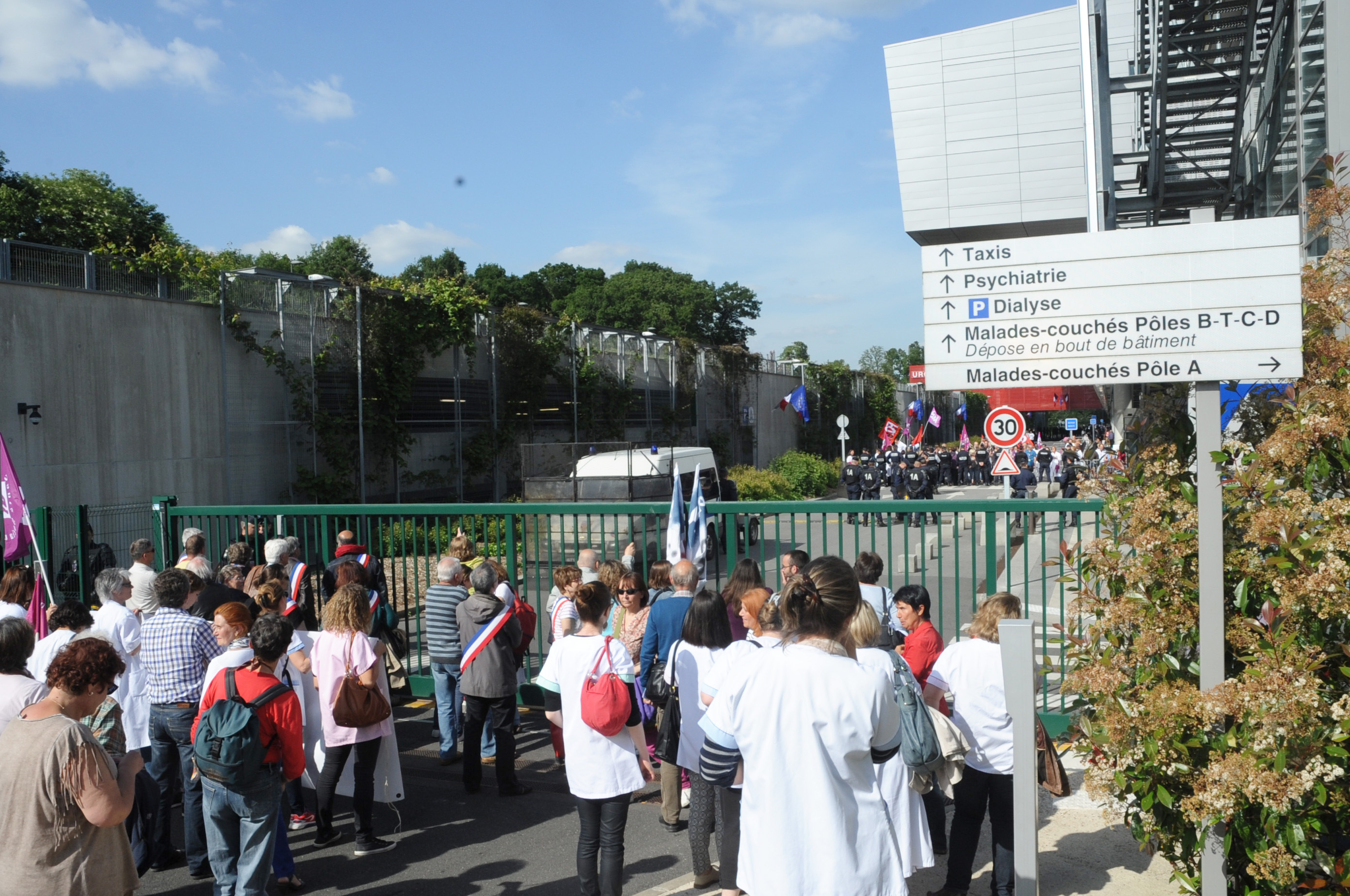 Télécharger la photo “Les CRS séparent les manifestants l'ors de l'inauguration du CHSF Centre Hospitalier Sud Francilien de Corbeil par Marisol TOURAINE Ministre des Affaires sociales”