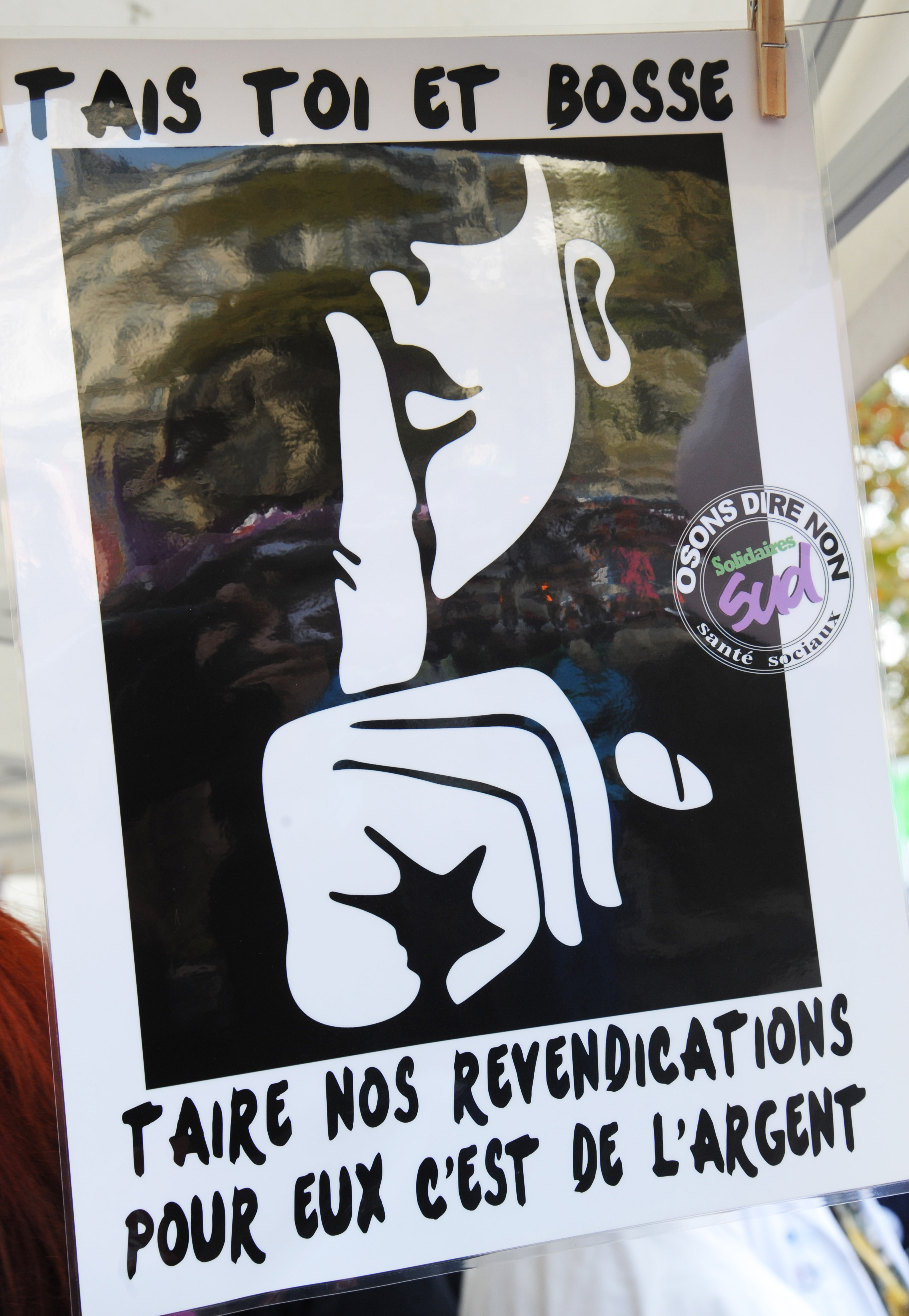 Télécharger la photo “T'ais toi et bosse taire nos revendications pour eux c'est de l'argent syndicat SUD Santé Sociaux”