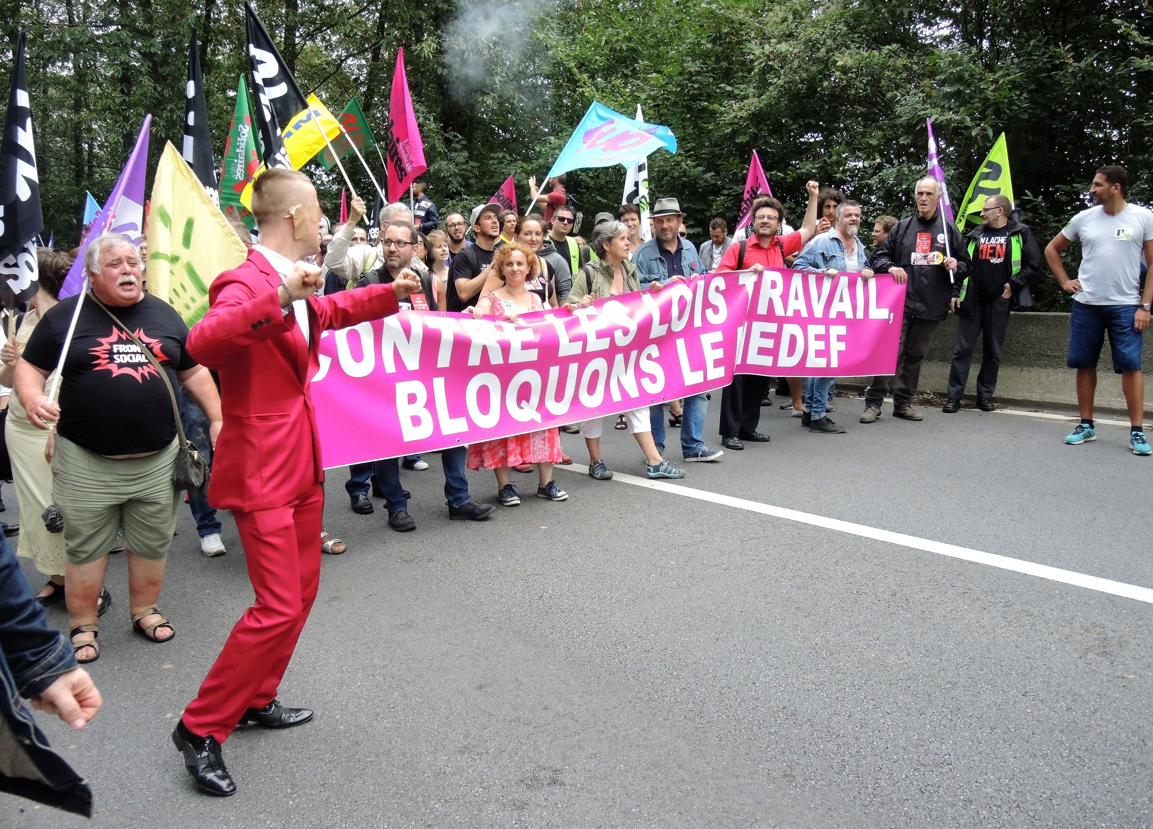 Télécharger la photo “Banderole Contre les lois travail bloquons le Medef”