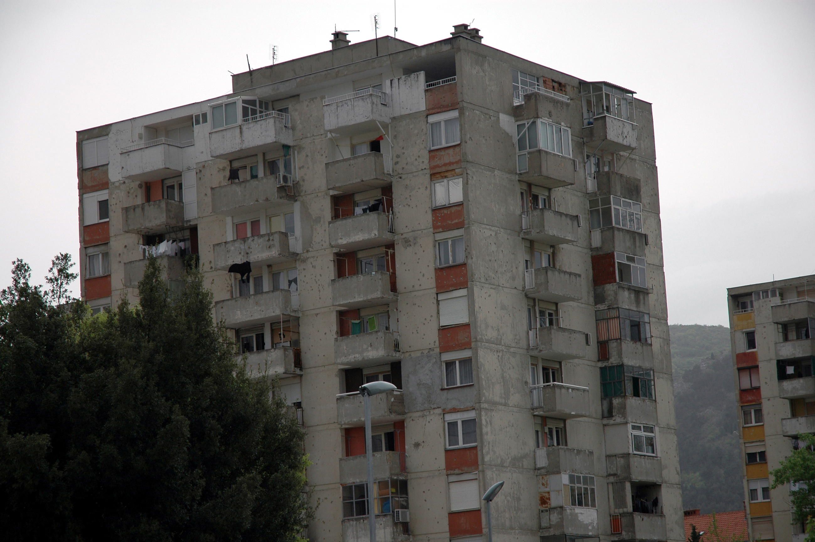 Télécharger la photo “Mostar, quartier Ouest, habitations couvertes d'impacts de tirs.”
