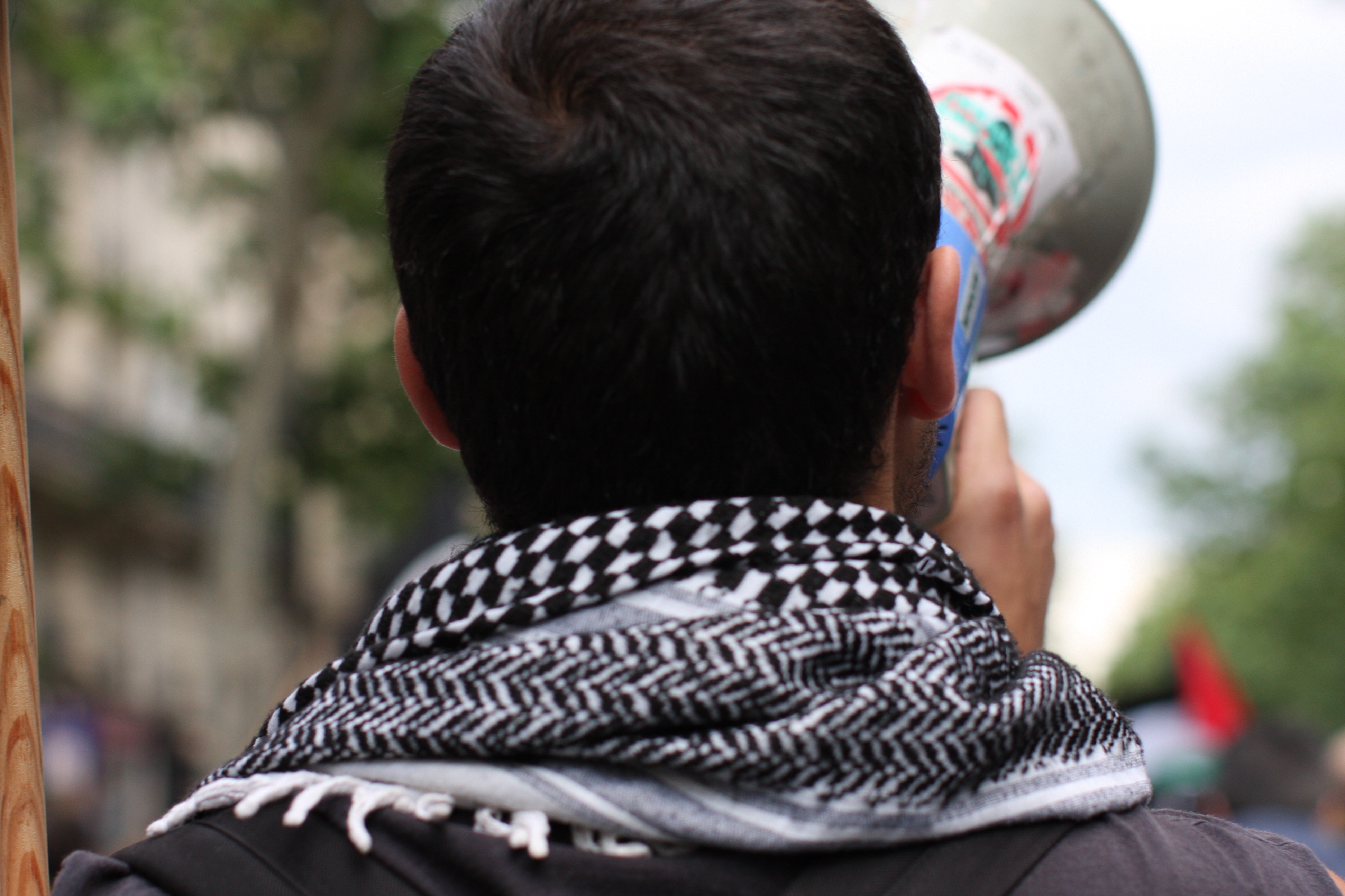 Télécharger la photo “Manifestant avec un haut-parleur portant un foulard palestinien.”