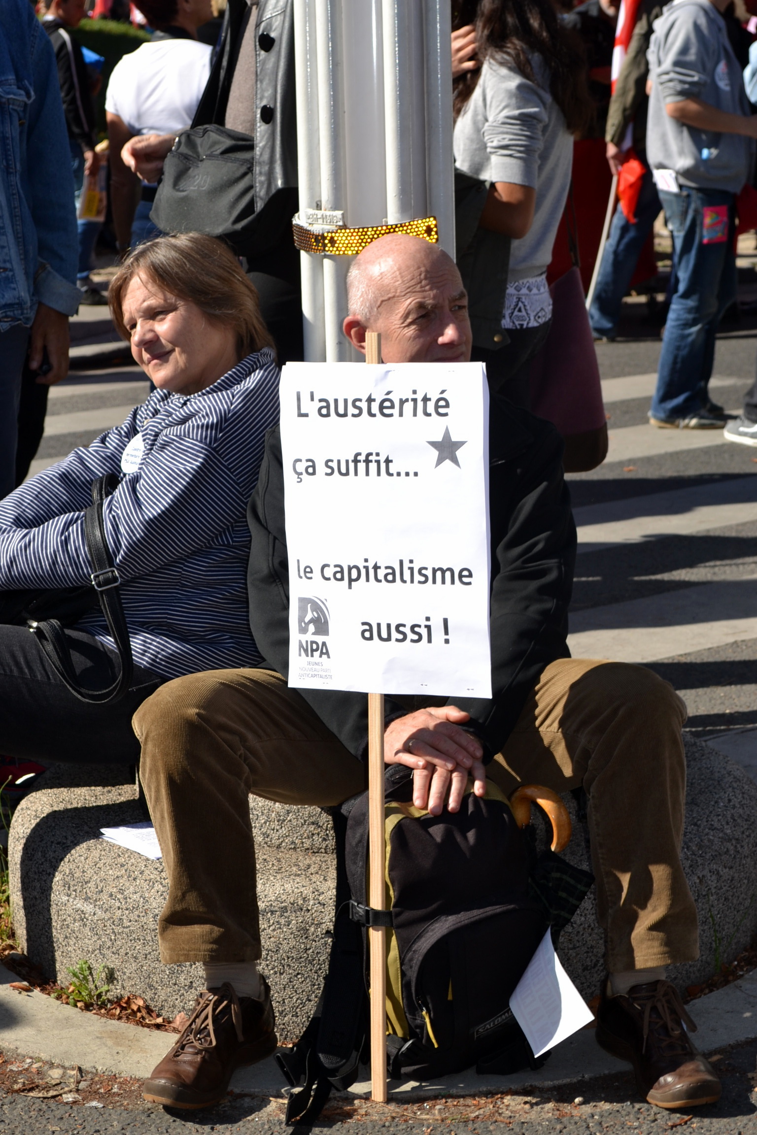 Télécharger la photo “Militant NPA avec slogan ''L'austérité ça suffit... Le capitalisme aussi”