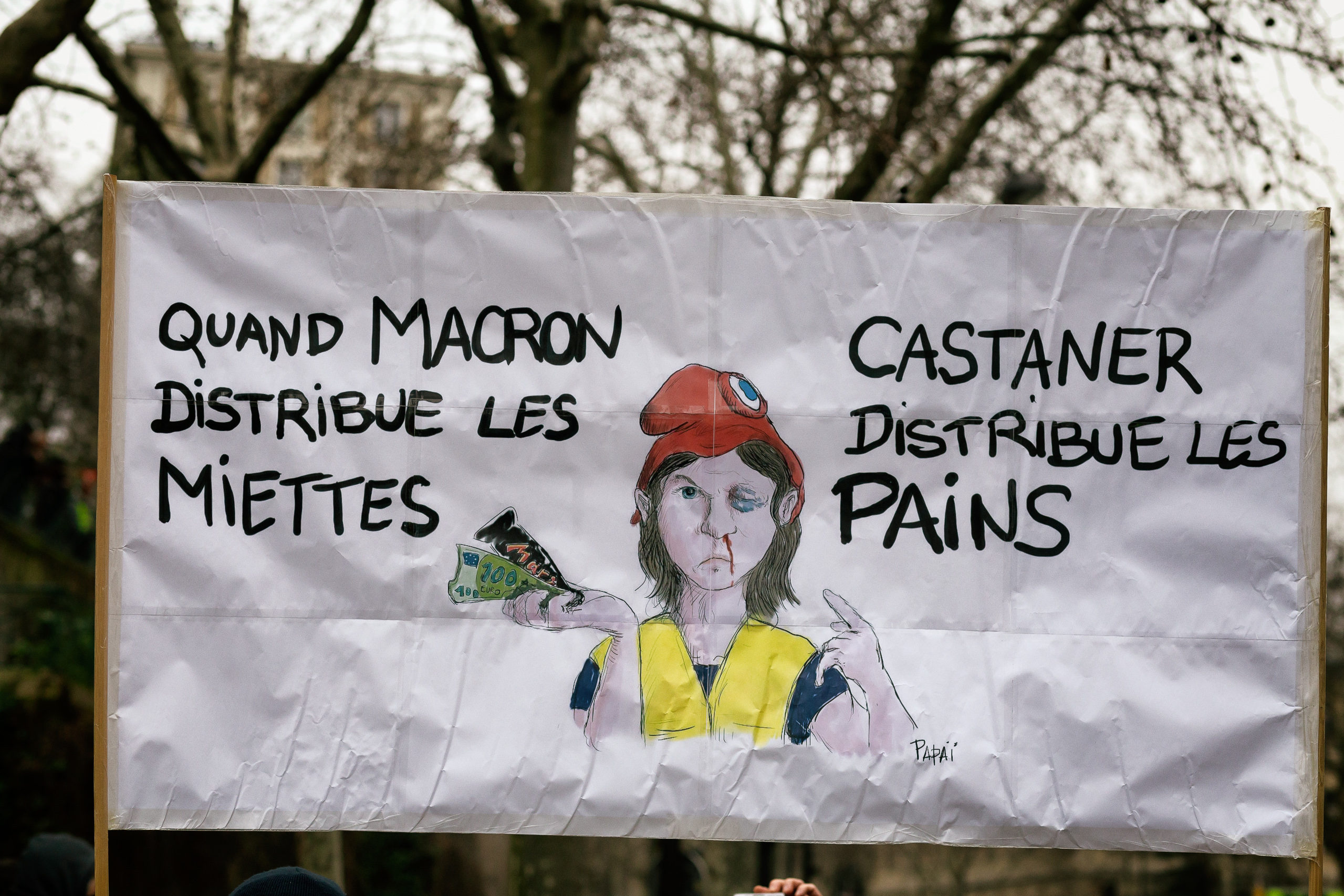 Télécharger la photo “Banderolle: Quand Macron distribue les miettes, Castaner distribue les pains”