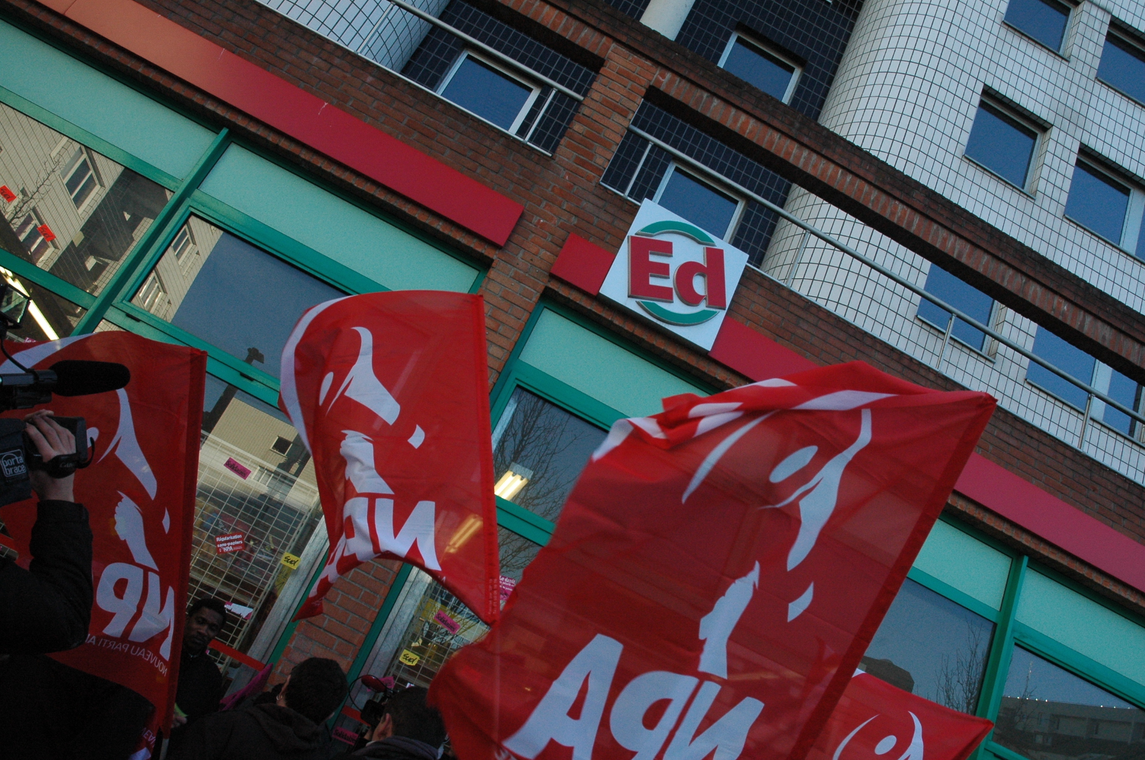 Télécharger la photo “Sigle ED d'Evry, magasin en grève depuis six semaines et drapeaux Npa.”