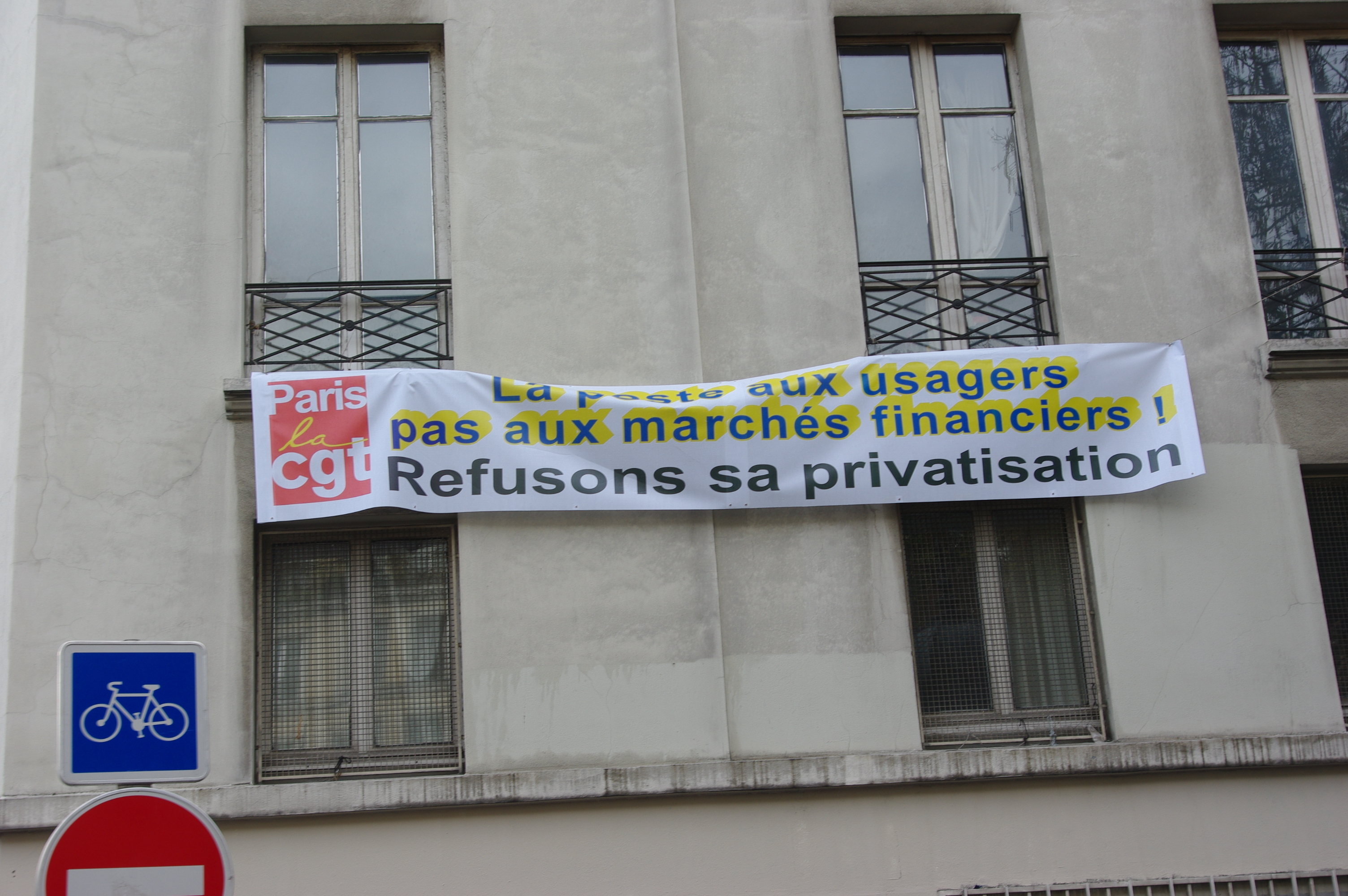 Télécharger la photo “banderole de la CGT contre la privatisation de la poste accrochée sur un batiment”