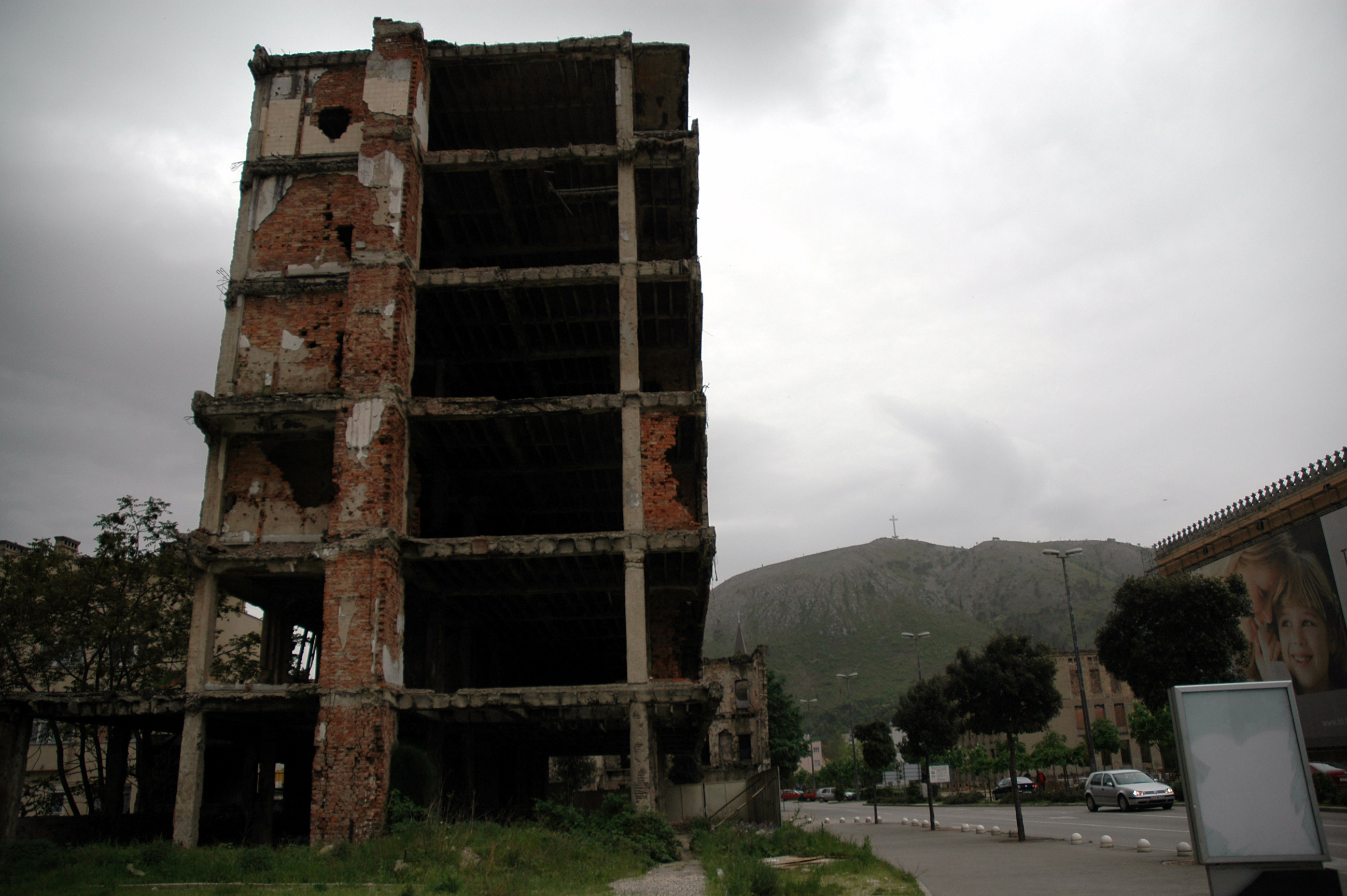 Télécharger la photo “Mostar, quartier Ouest, habitations couvertes d'impacts de tirs.”