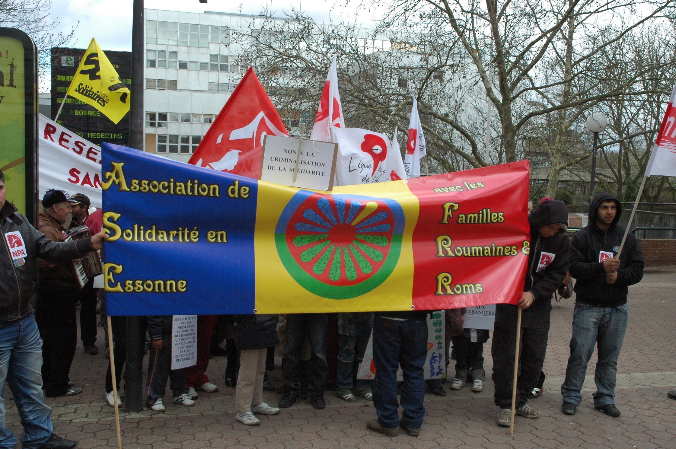 Télécharger la photo “Banderole ASEFRR,Association Solidaire en Essonne avec les Familles Rroms,Roumaines.”