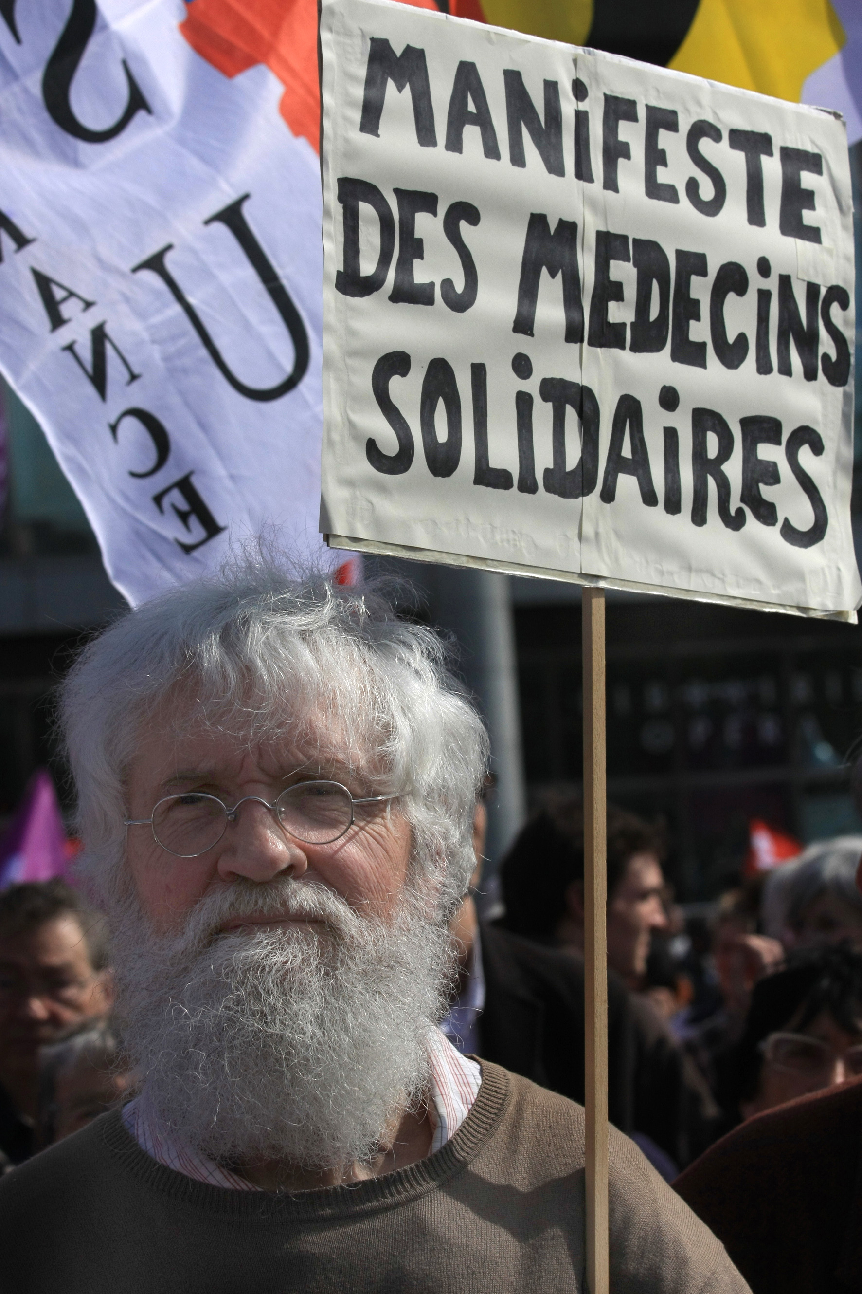 Télécharger la photo “Didier Poupardin azvec pancarte manifeste des médecins solidaires”