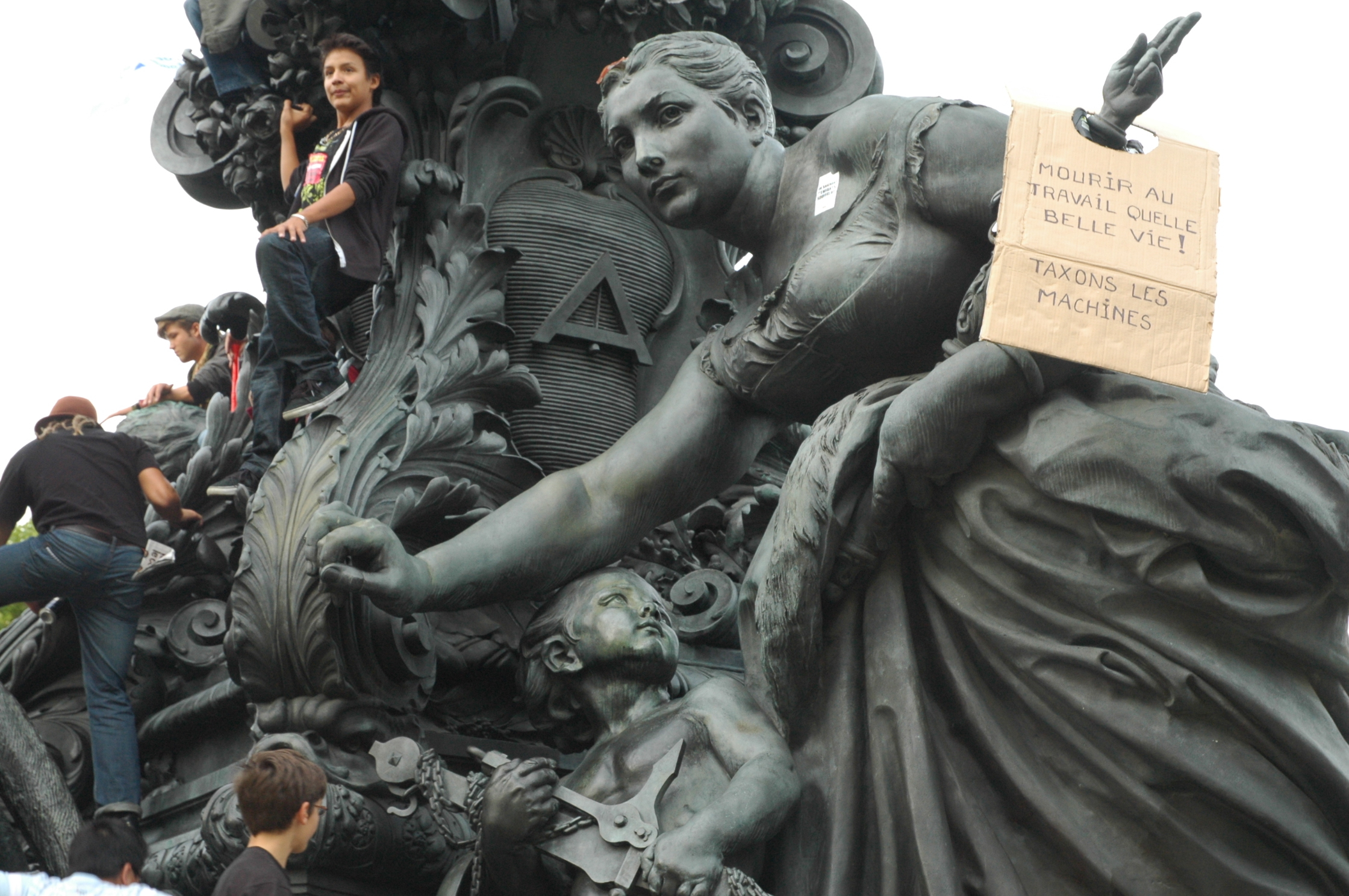 Télécharger la photo “Figure allégorique au pied de la Statue de la République avec pancarte, Mourir au travail qu'elle belle vie! TAXONS LES MACHINES, place de la Nation.”