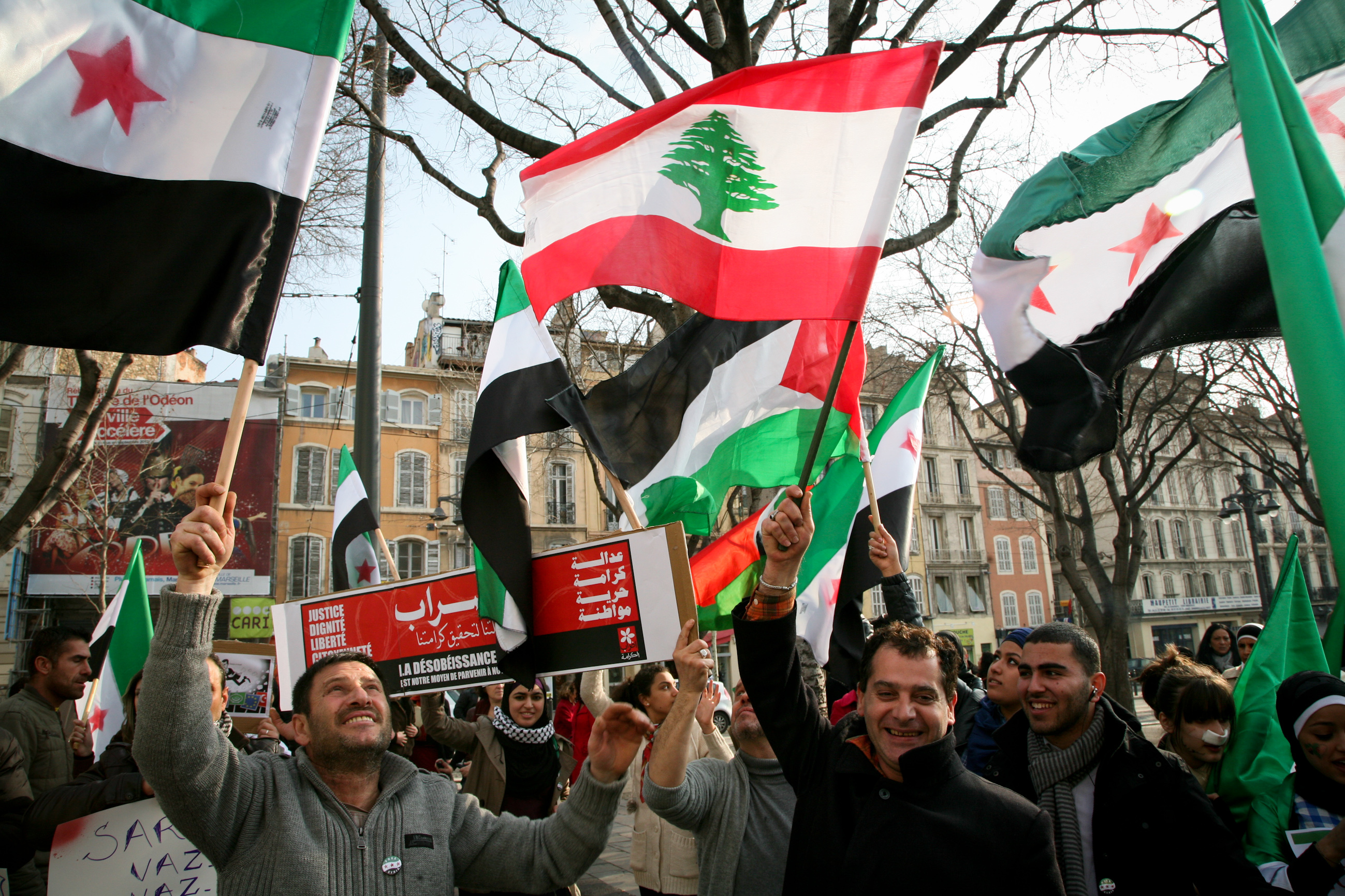 Télécharger la photo “Manifestant brandissant les drapeaus syriens et libanais.”
