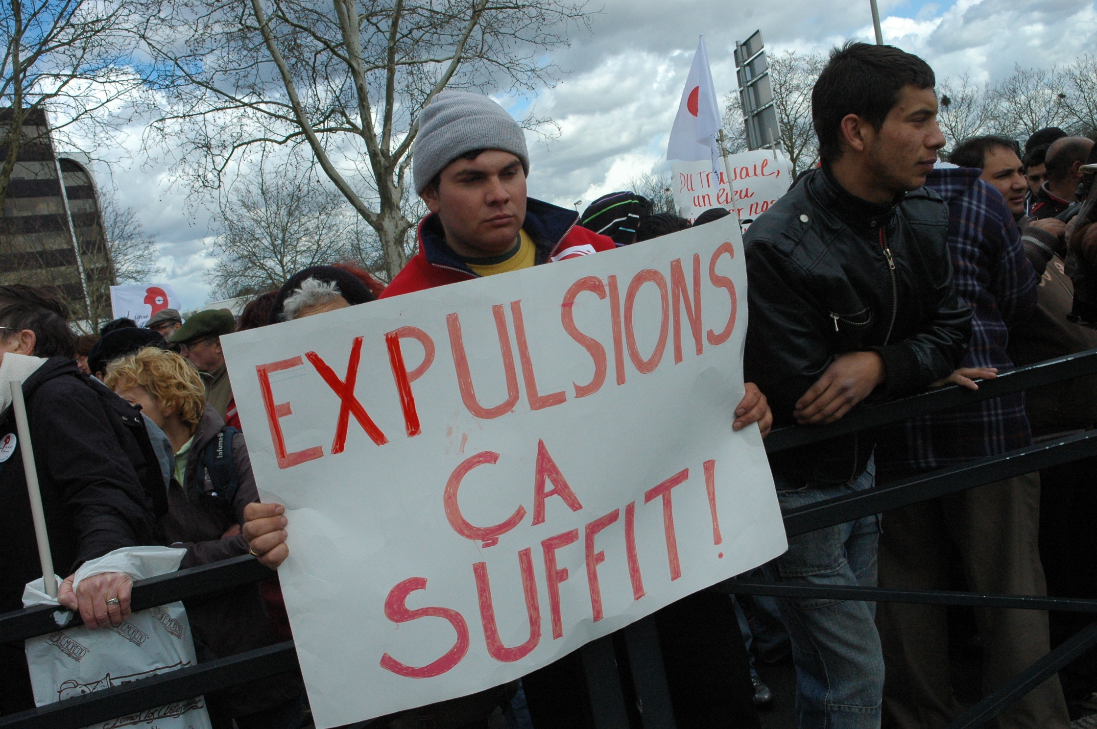 Télécharger la photo “Pancarte Expulsions ça suffit! jeunes Rroms devant préfecture d'Evry.”
