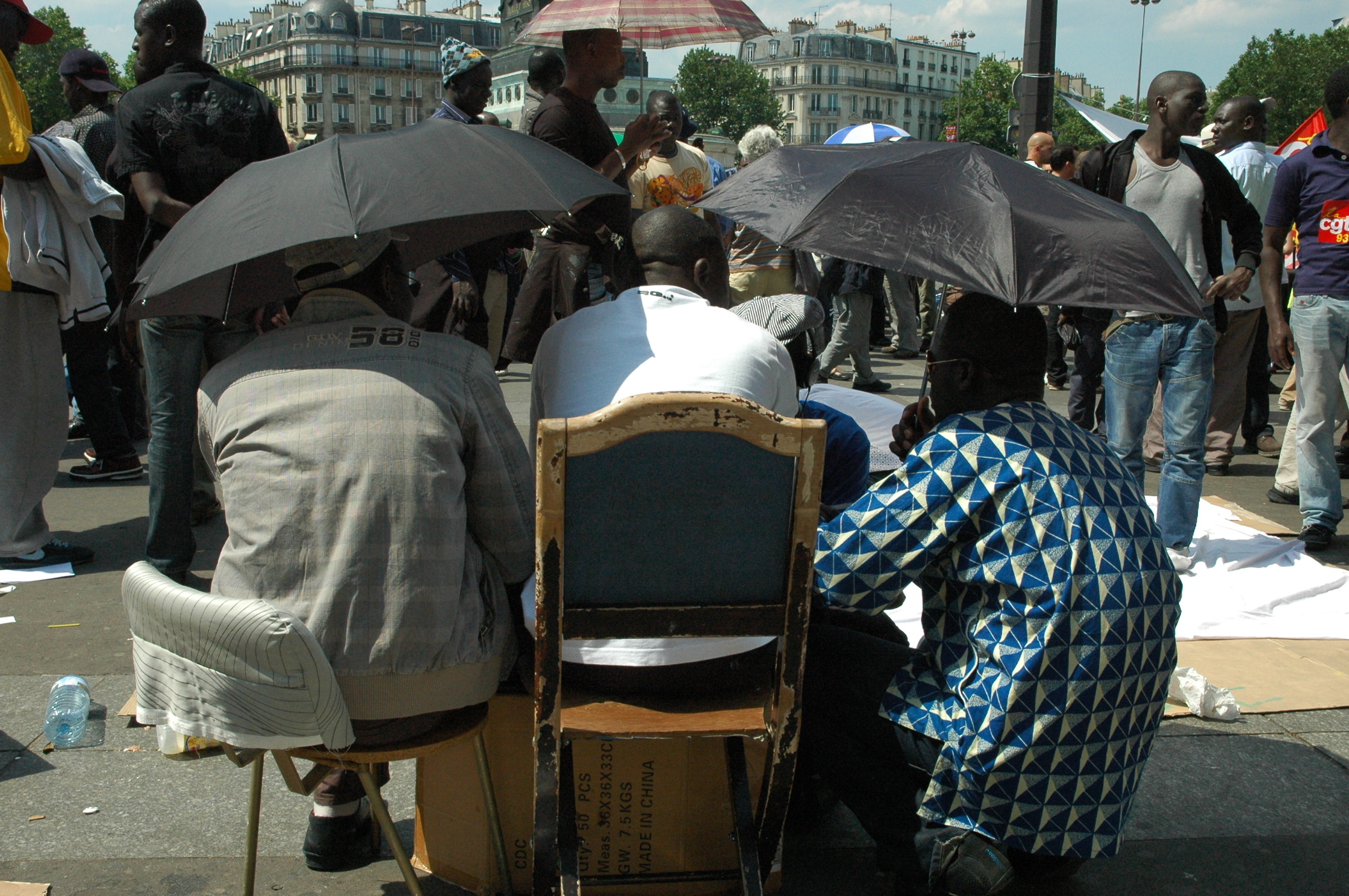 Télécharger la photo “sans-papiers en occupation au pied de l'Opéra Bastille avec parapluies contre le soleil Parisien.”